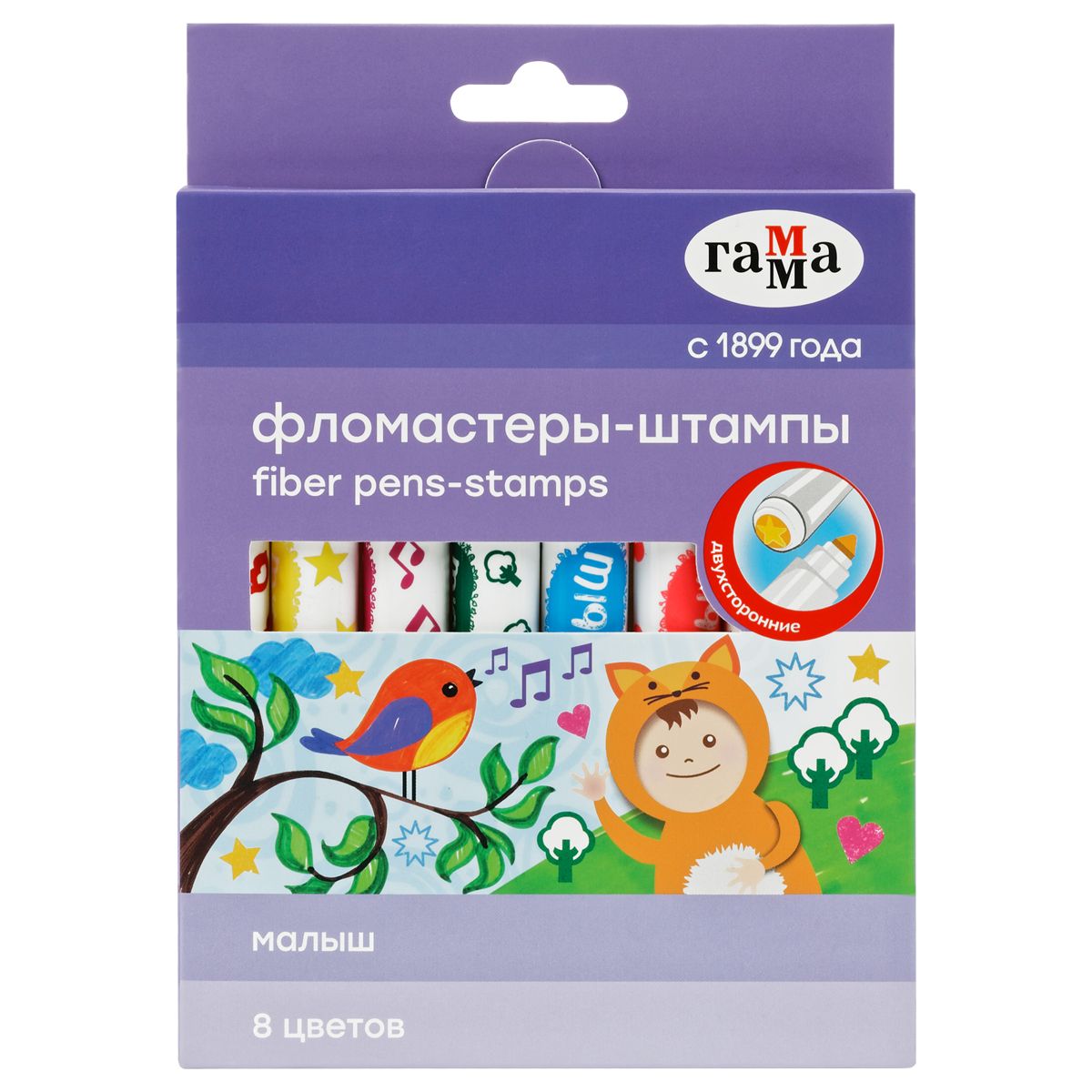 Фломастеры-штампы двусторонние Гамма "Малыш", 08цв., утолщенные, смываемые, картон. упак., европодвес