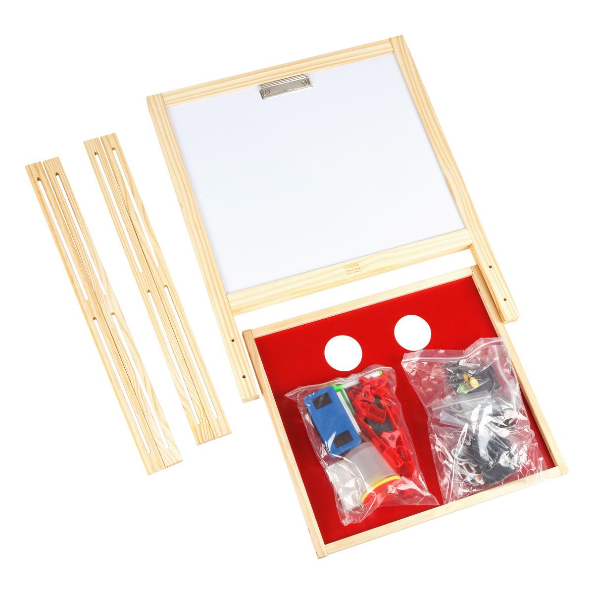 Доска прослужит не один год, так как мольберт оснащен растущим механизмом за счет конструкции ножек. Высота регулируется до 105 см. Размер рабочей поверхности доски 38*45 см.