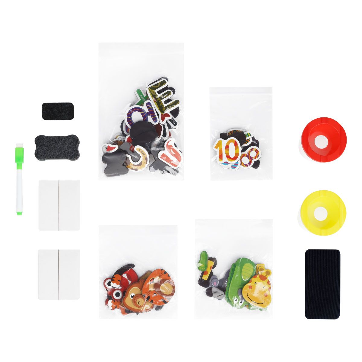 В комплект входит: маркер, 12 мелков, 2 губки, бумажный ролл, 2 стаканчика-непроливайки и набор магнитов (цифры, буквы и милые зверушки), а также инструкция по сборке.