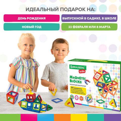 Магнитный конструктор BIG MAGNETIC BLOCKS-64, 64 детали, с колесной базой, BRAUBERG KIDS, 663847
