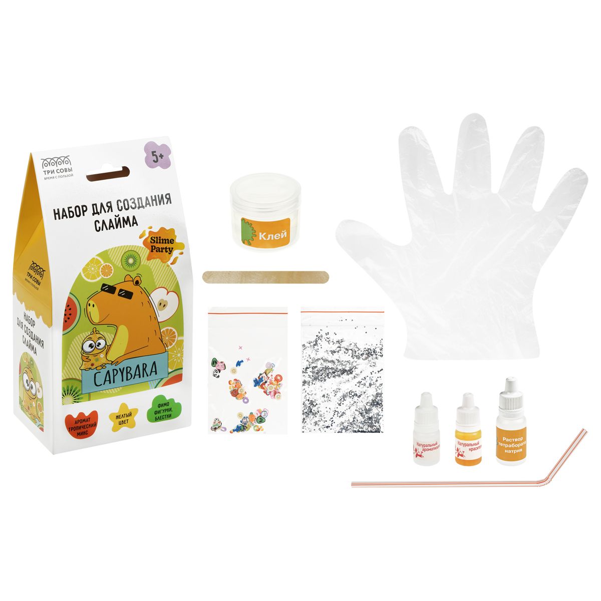 Набор для создания слайма ТРИ СОВЫ Slime party "Капибара", желтый, наполнение - фимо фигурки и блестки, аромат тропический микс, картонная коробка