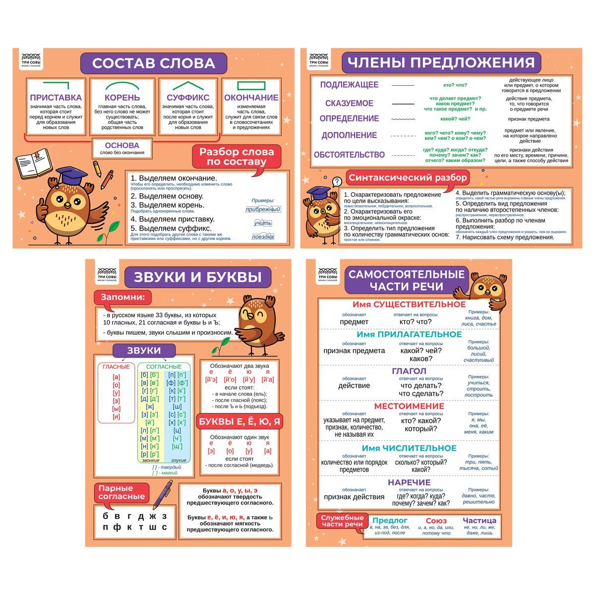 Набор обучающих плакатов ТРИ СОВЫ "1-4 класс. Русский язык", А4, 4 плаката