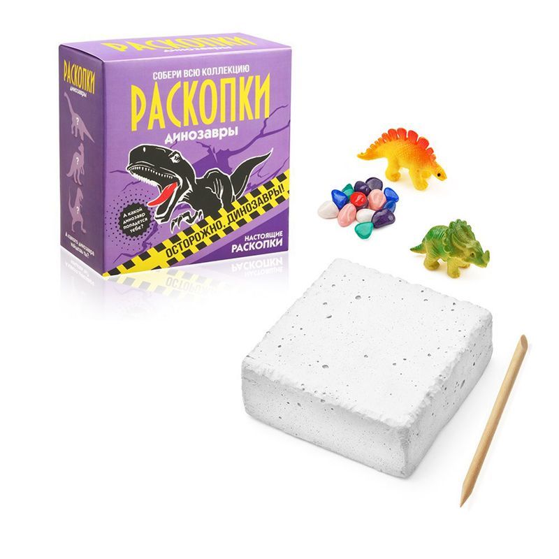 В наборе: деревянный стек для дробления, окаменелый грунт с сокровищами (россыпь разноцветных камней и фигурки динозавров из пластика). Цвета находок в ассортименте.