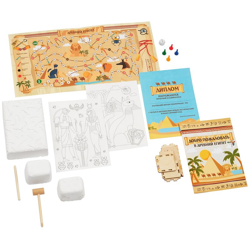 Набор разработан в формате квеста. Выполните все задания из буклета – сыграйте в настольную игру, разгадайте загадки и найдите древние сокровища с настоящей египетской монетой. Все свои находки можно сложить в сундучок, который есть в комплекте. В конце путешествия ребенок получит настоящий диплом от сообщества кладоискателей и составит рассказ о своих приключениях.
