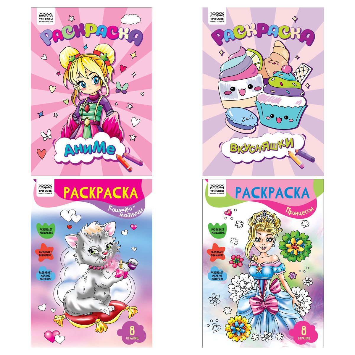 Раскраска А4, 8 стр., ТРИ СОВЫ "Для девочек"