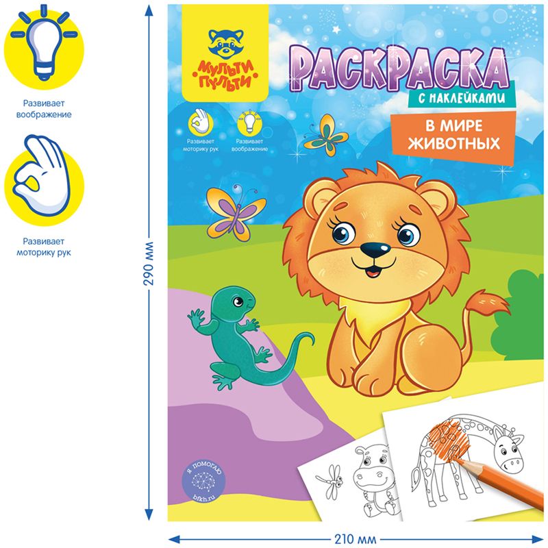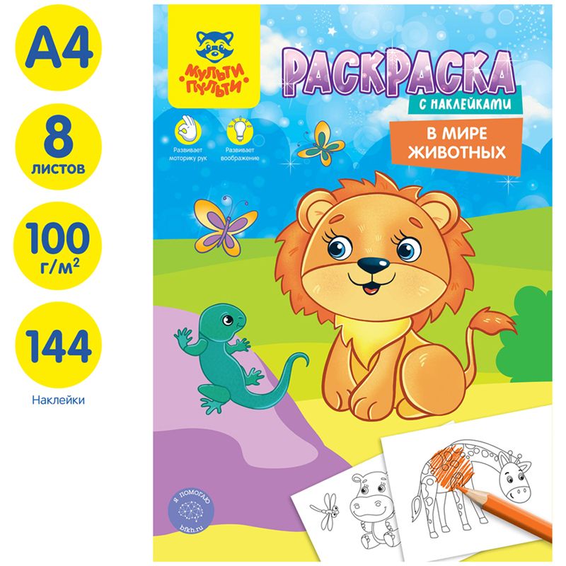 Раскраска А4 Мульти-Пульти "В мире животных", 16стр., с наклейками