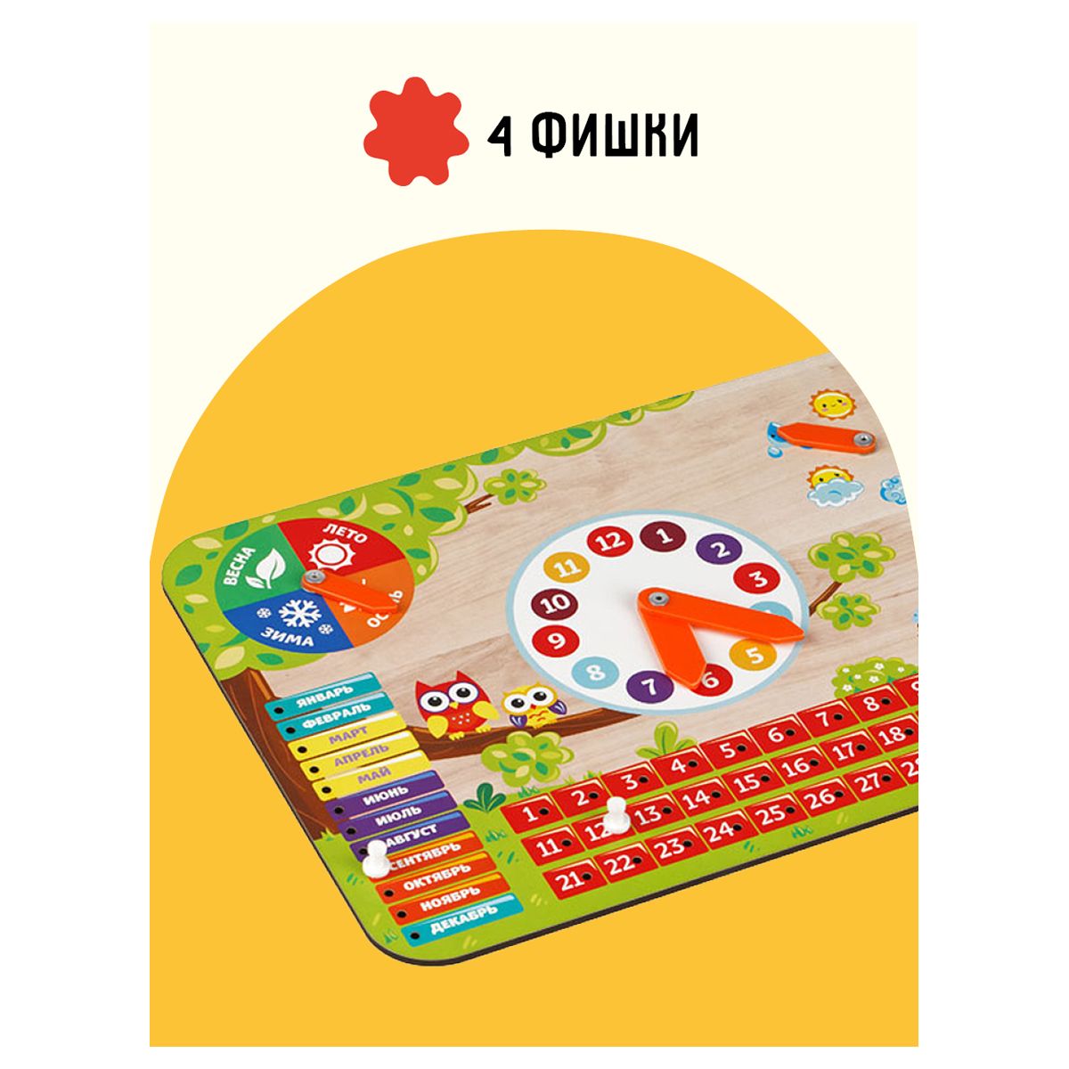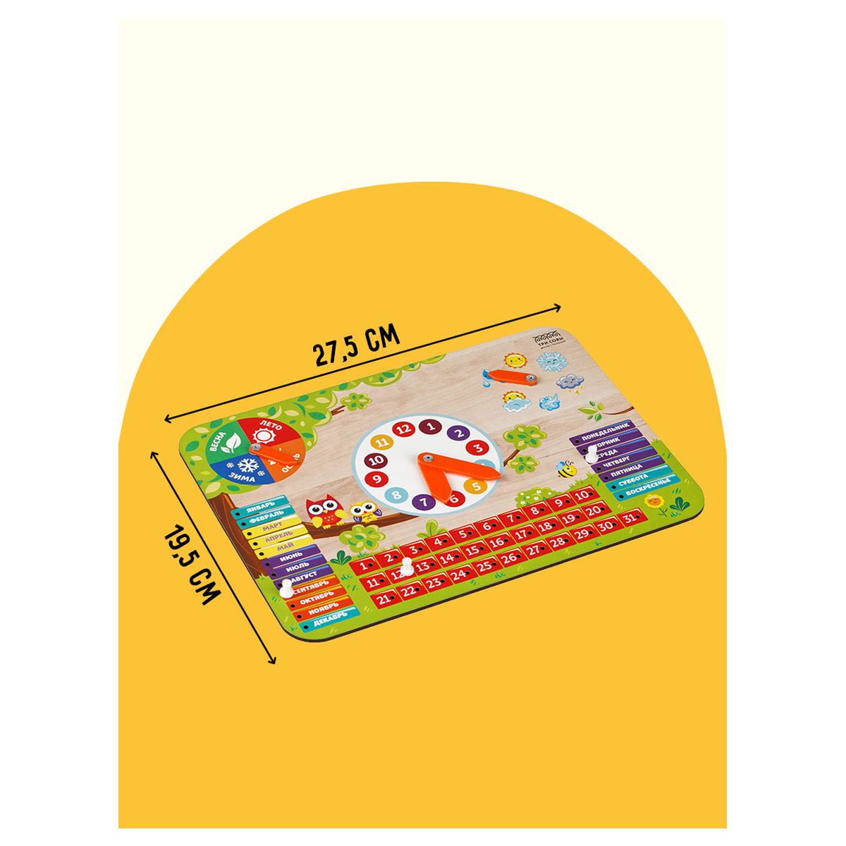 Игрушка обучает ребенка ориентироваться во времени, погоде и явлениях природы, помогает изучить дни недели, месяцы, времена года.
