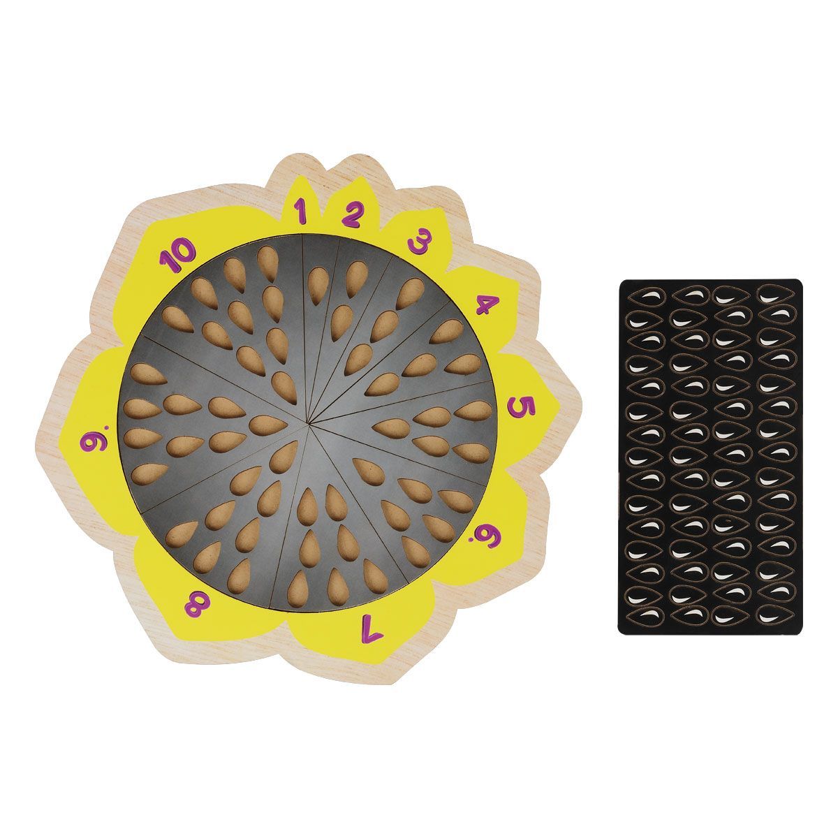 Игровая основа имеет форму подсолнуха, съёмные детали, фигурки для счета на плашках-20 шт.(семечек 60 шт.)