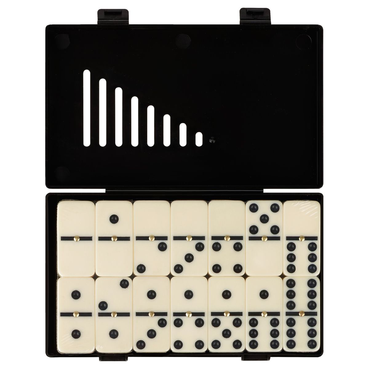 В наборе 28 пластиковых белых фишек с контрастными черными точками и металлическим спиннером в середине для комфортного перемешивания. Удобный стильный пластиковый кейс с надежными замками обеспечивает удобное хранение и возможность всюду брать игру с собой.