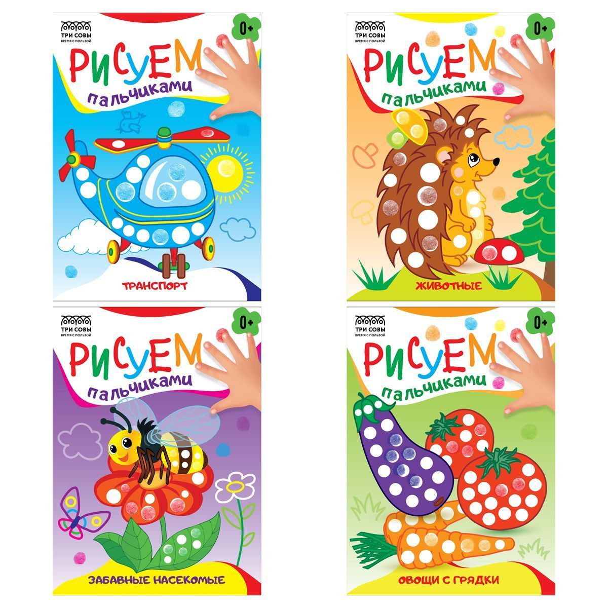 Раскраски серии «Рисуем пальчиками» бренда «ТРИ СОВЫ» предназначены для самых маленьких художников. Это одно из самых полезных и увлекательных занятий. Внутренний блок 8 страниц плотной бумаги. Пальчиковые раскраски развивают мелкую моторику, тактильную чувствительность, воображение и образное мышление, а также помогают выучить цвета и пополнить словарный запас. Пальчиковое рисование – отличное занятие, чтобы разнообразить досуг и интересно провести время с ребенком, а главное с пользой. Благодаря формату А5 данную раскраску удобно брать с собою в дорогу. В запайке 4 штуки на разные темы, которые помогают малышу познакомиться с окружающим миром: "«Овощи с грядки», «Транспорт», «Животные», «Забавные насекомые».
