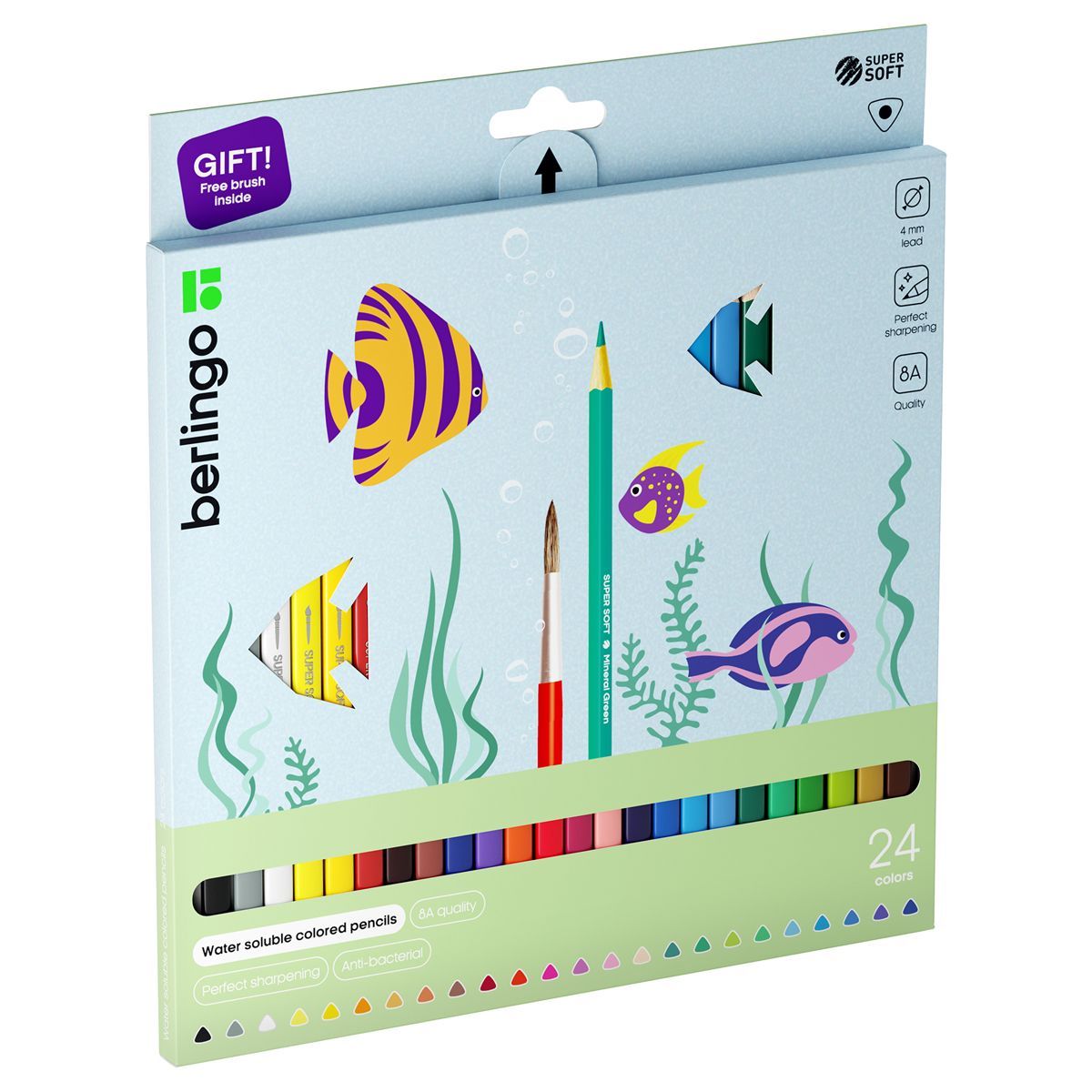 Карандаши акварельные Berlingo "SuperSoft. Рыбки", 24цв.+кисть, трехгран., заточен., картон, европодвес