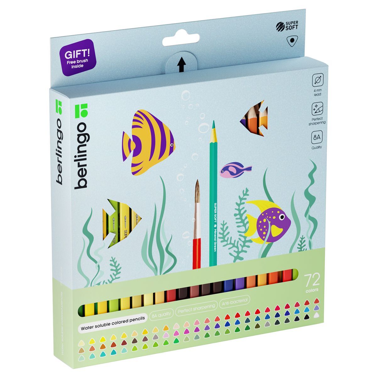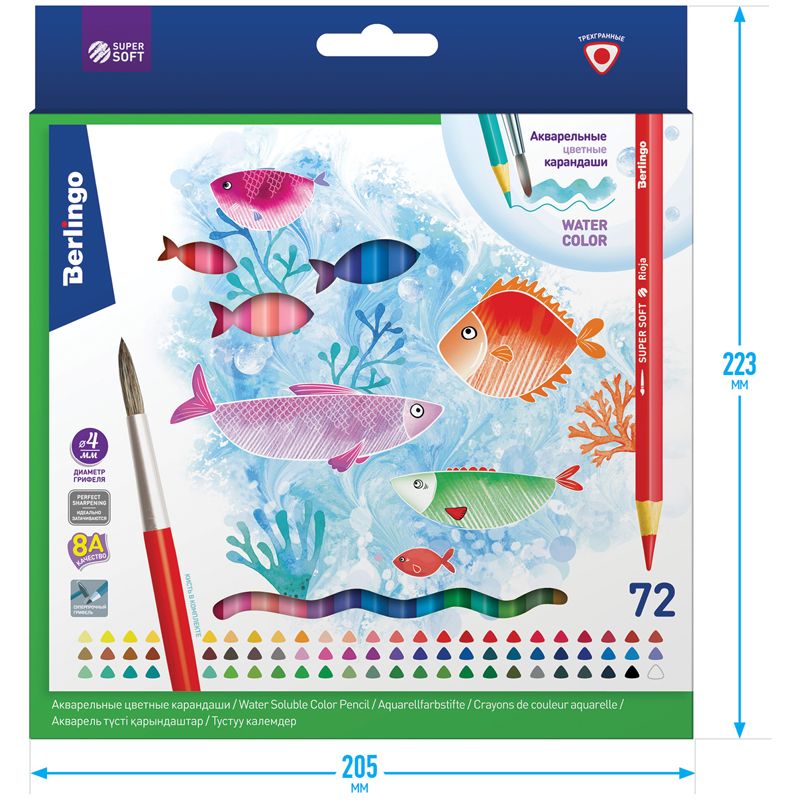Карандаши акварельные Berlingo "SuperSoft. Рыбки", 72цв.+кисть, трехгран., заточен., картон, европодвес
