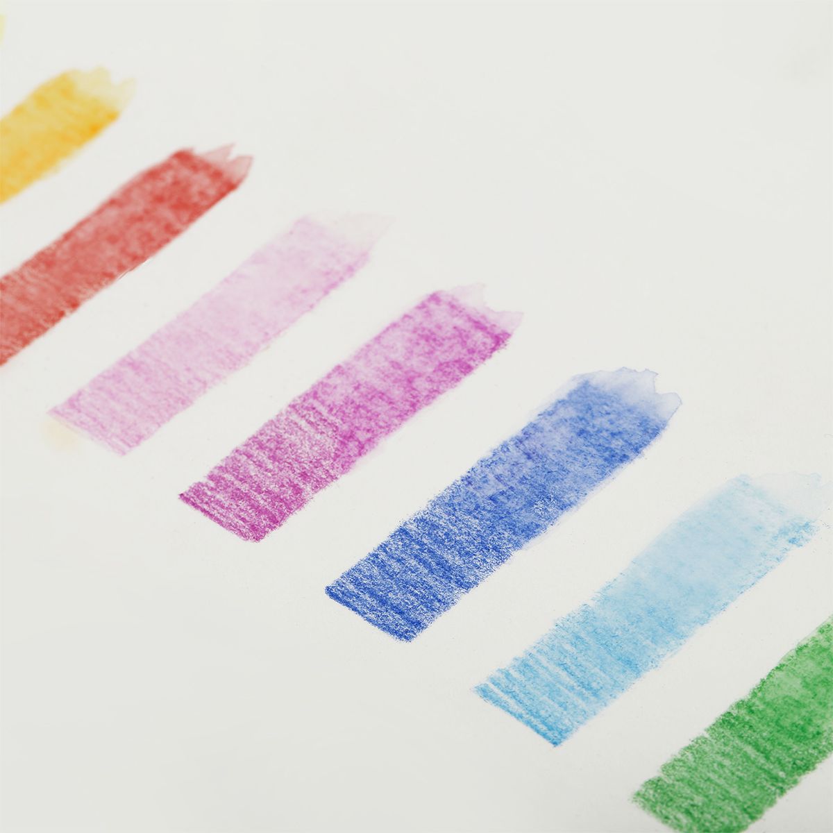 Карандаши выполнены в шестигранном корпусе из прочного дерева. Водорастворимый грифель карандашей состоит из высококачественных пигментов ярких оттенков. Мягкость грифеля обеспечивает легкое скольжение и комфортное рисование. Благодаря специальной технологии проклеивания грифеля (SV), грифель не ломается при падении и затачивании. Отстирываются с большинства тканей.