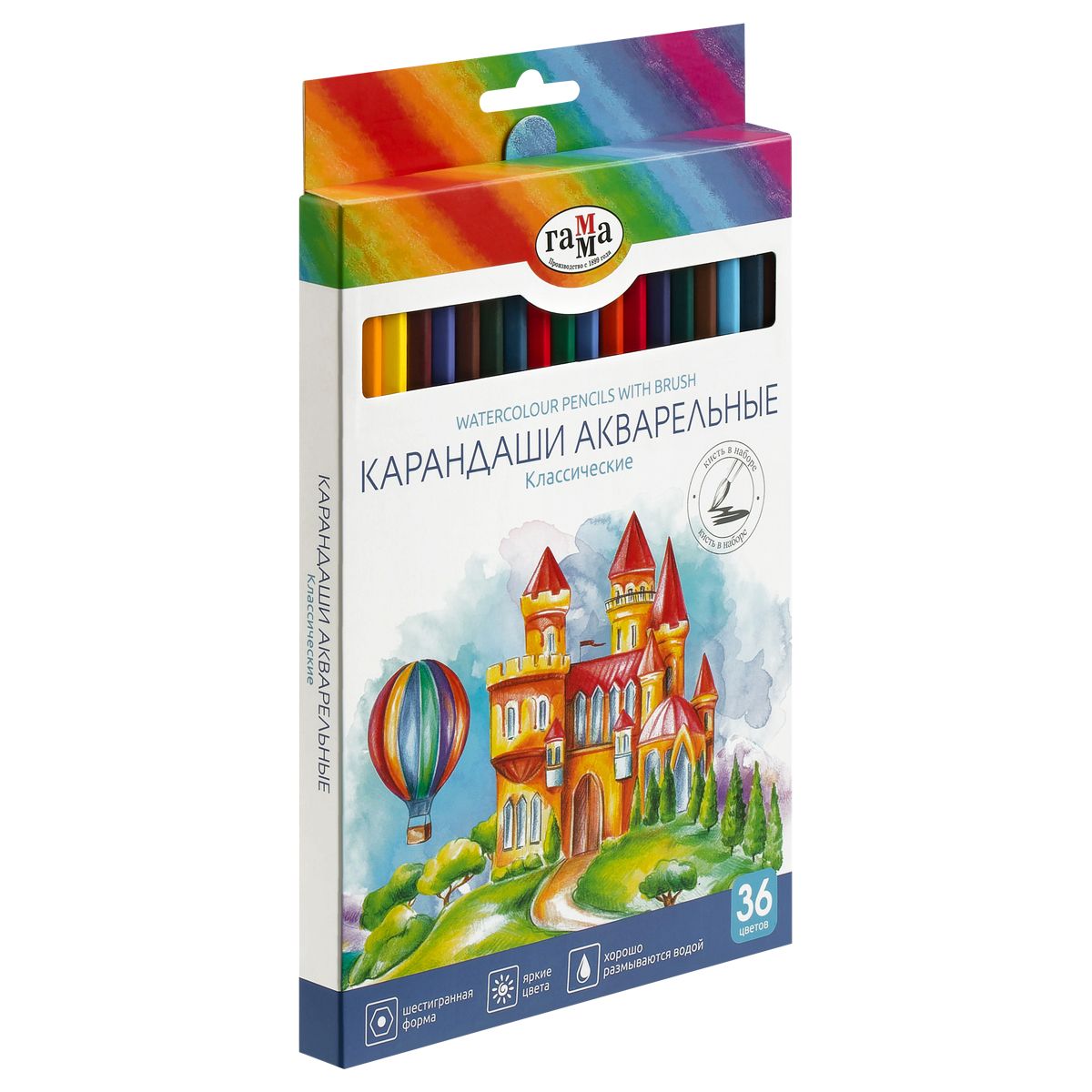 Карандаши акварельные Гамма "Классические", 36цв., шестигранные, заточен., с кистью, картон. упак., европодвес