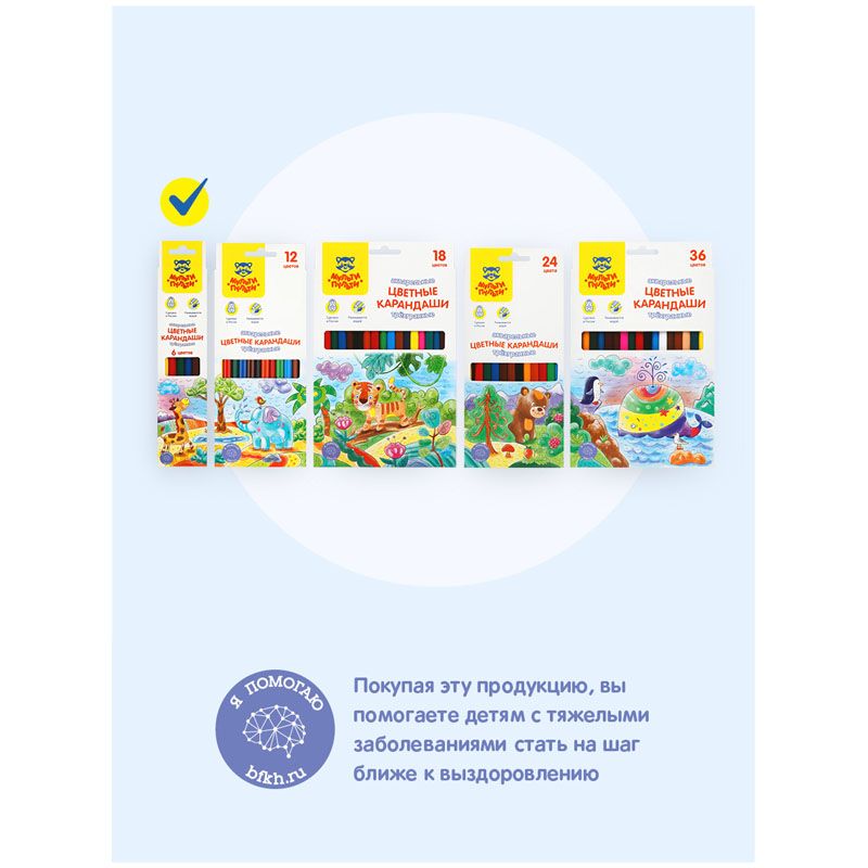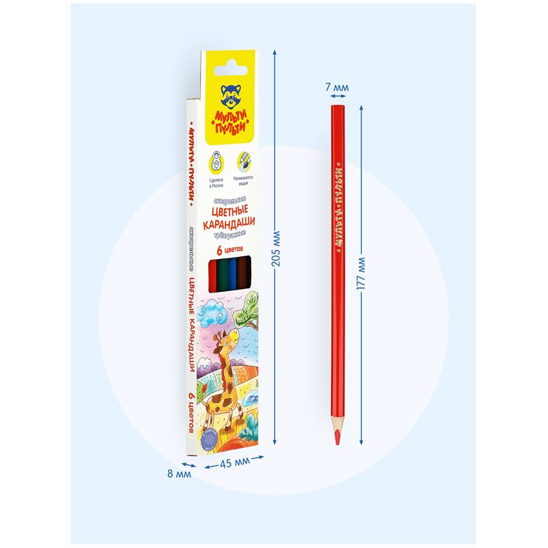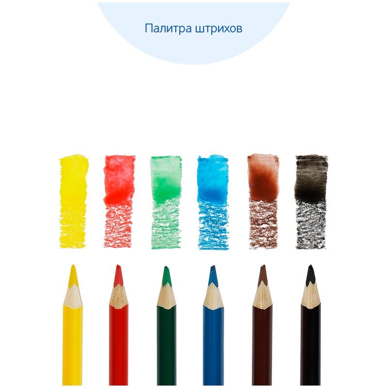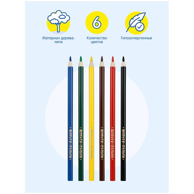 В наборе 6 цветов, диаметр грифеля составляет 3,3 мм, что увеличивает срок службы карандаша. Карандаши упакованы в картонную коробку с глянцевой ламинацией и европодвесом. Товар предназначен для детей старше 3-х лет.