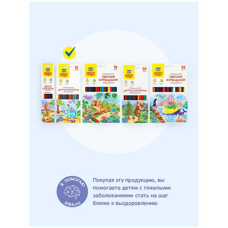 В наборе 12 цветов, диаметр грифеля составляет 3,3 мм, что увеличивает срок службы карандаша. Карандаши упакованы в картонную коробку с глянцевой ламинацией и европодвесом. Товар предназначен для детей старше 3-х лет.