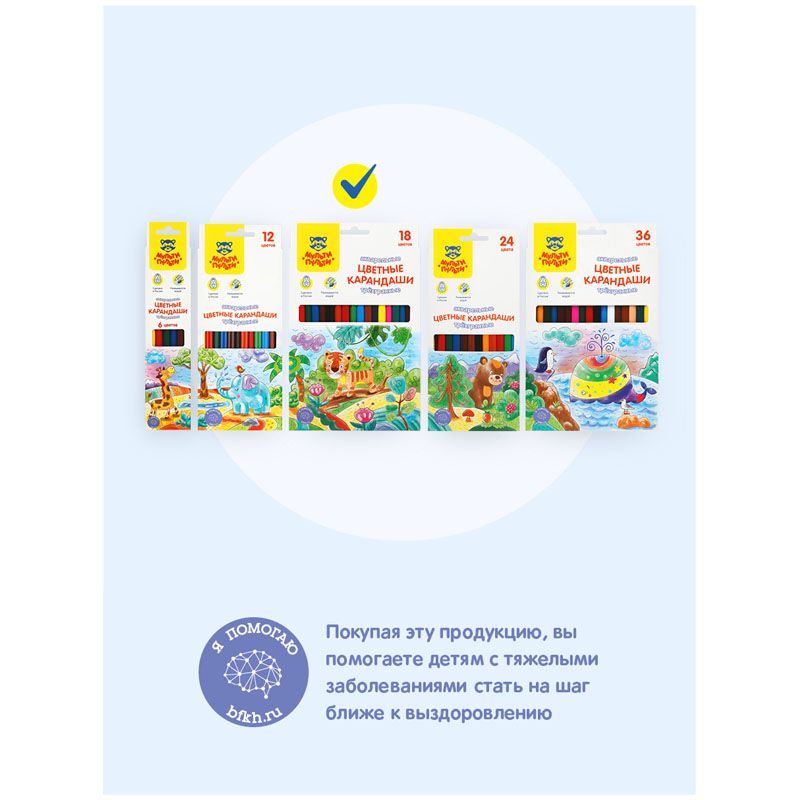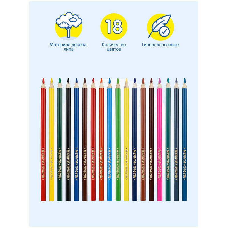 В наборе 18 цветов, диаметр грифеля составляет 3,3 мм, что увеличивает срок службы карандаша. Карандаши упакованы в картонную коробку с глянцевой ламинацией и европодвесом. Товар предназначен для детей старше 3-х лет.