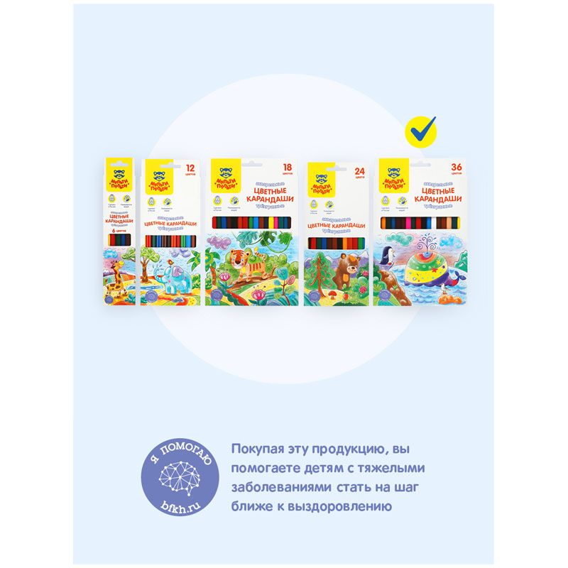 В наборе 36 цветов, диаметр грифеля составляет 3,3 мм, что увеличивает срок службы карандаша. Карандаши упакованы в картонную коробку с глянцевой ламинацией и европодвесом. Товар предназначен для детей старше 3-х лет.