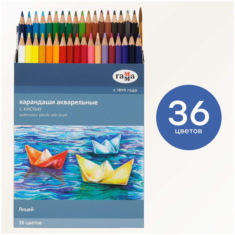 Карандаши акварельные Гамма "Лицей", 36цв., шестигранные, заточен., с кистью, картон. упаковка, европодвес