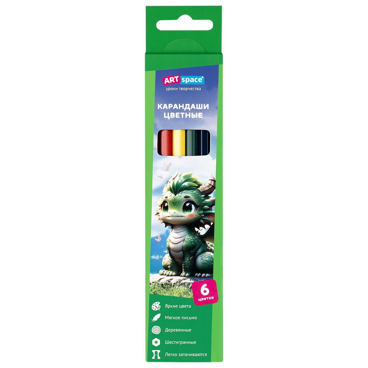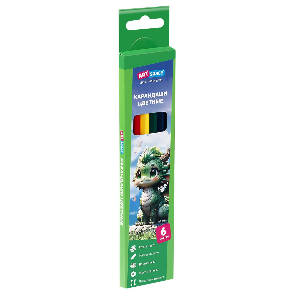 Карандаши цветные ArtSpace "Дракоша", 06цв., шестигранные, заточен., картон. упак., европодвес
