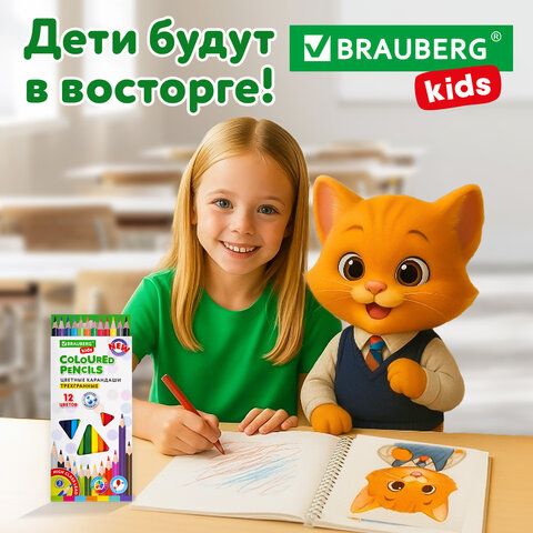 Карандаши цветные BRAUBERG KIDS NEW, 12 цветов, трехгранный корпус, грифель 3 мм, 182001