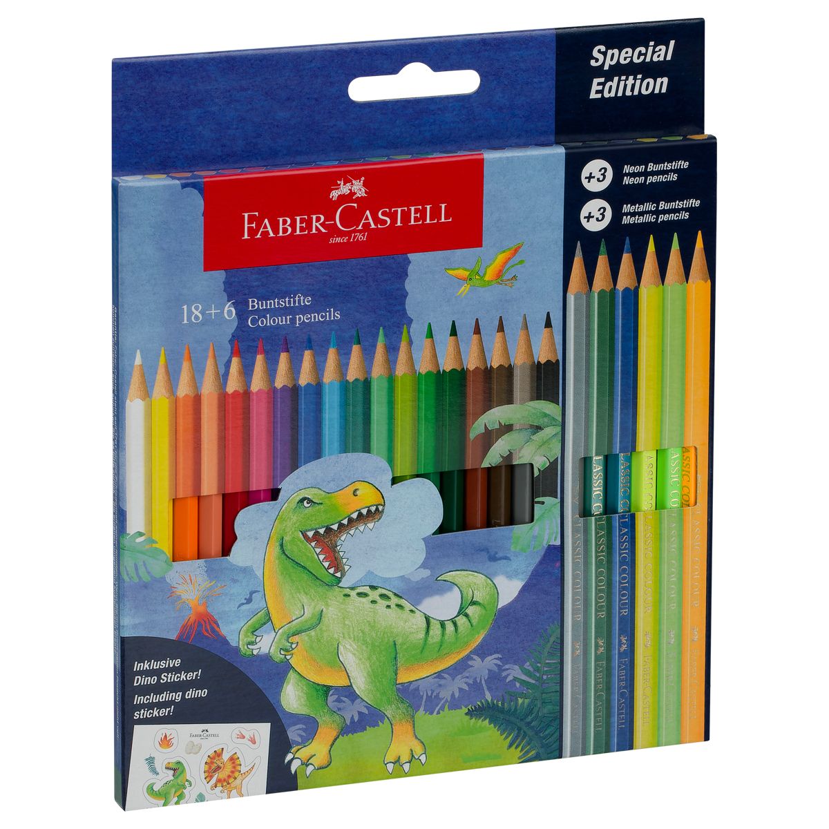 Карандаши цветные Faber-Castell "Dinosaur", 18 цв. + 3 цв. металл. + 3 цв. неон. + наклейки, заточен., картон, европодвес