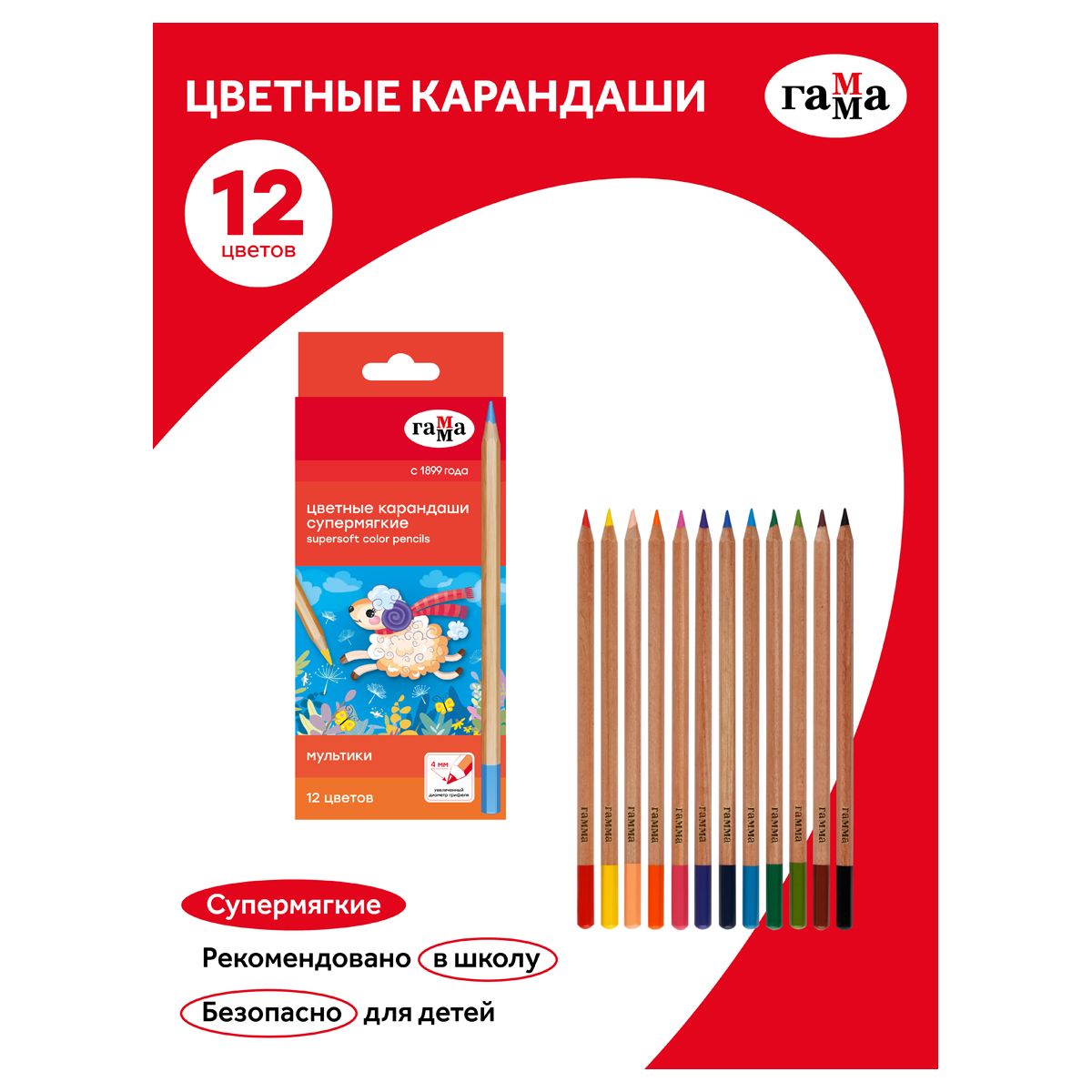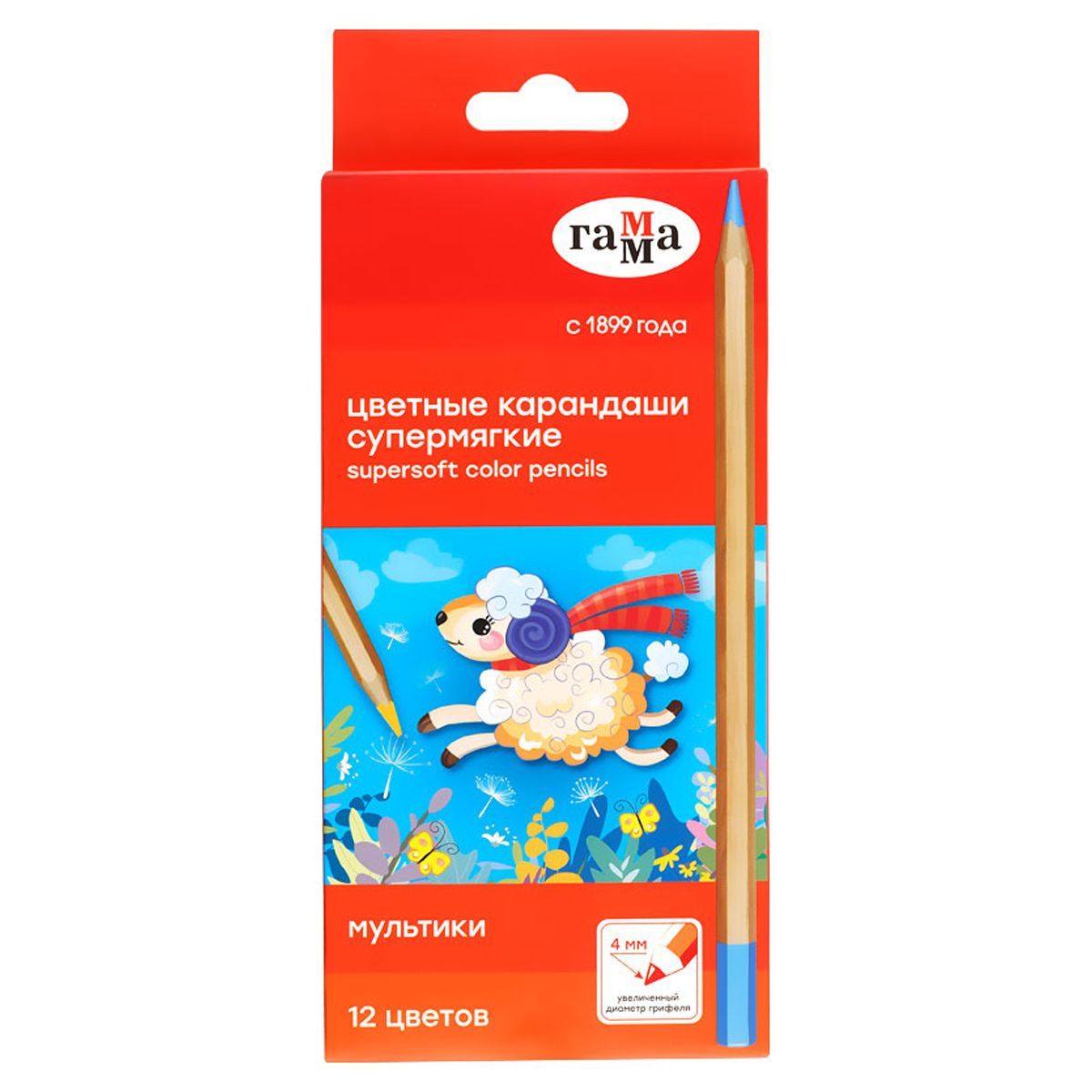 Карандаши цветные Гамма "Мультики", 12цв., супермягкие, увелич. диаметр грифеля 4,0мм, заточен., картон. упак., европодвес
