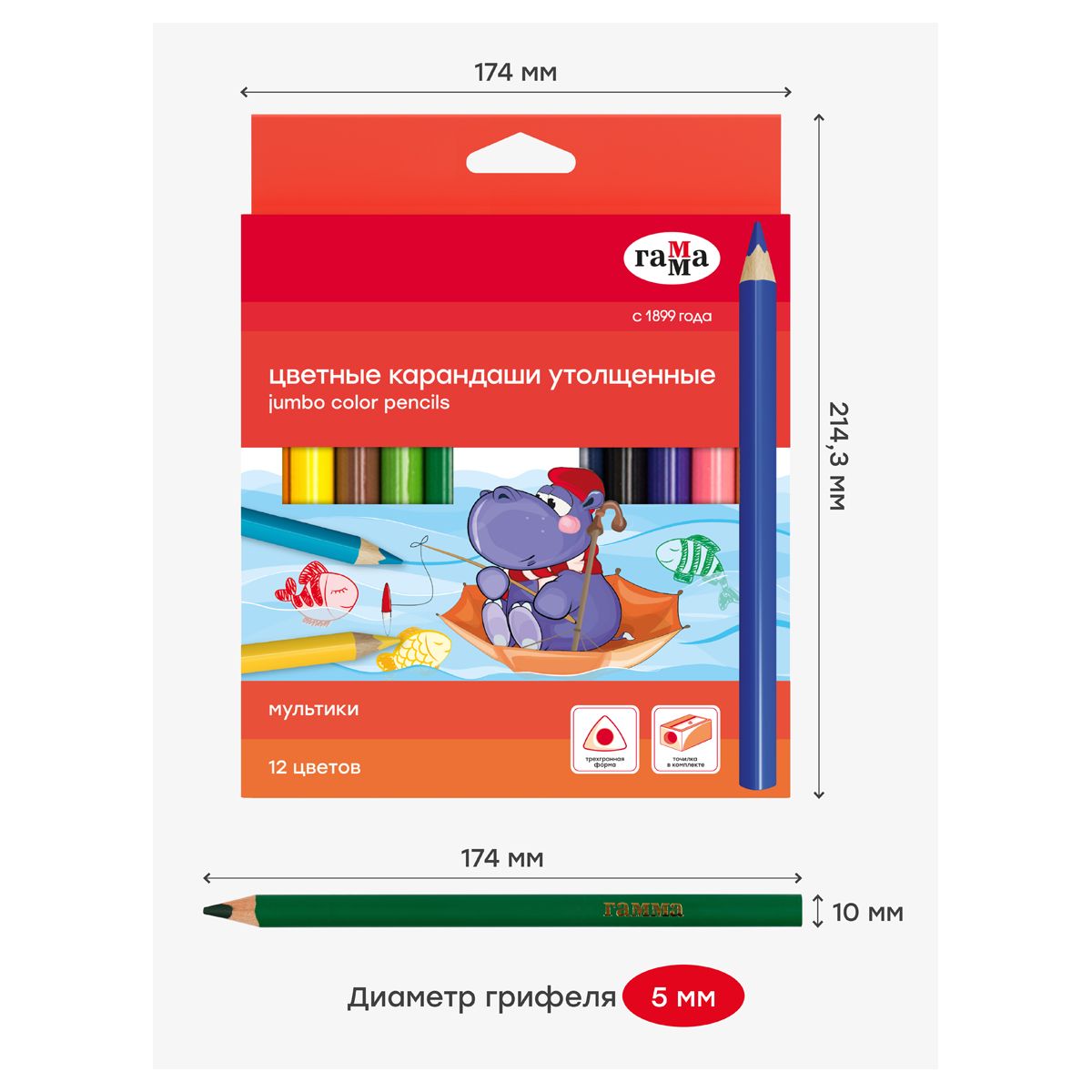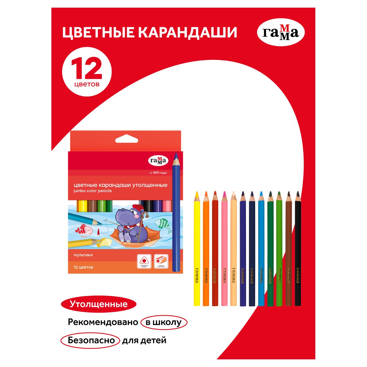 Карандаши цветные Гамма "Мультики", 12цв., утолщенные, заточен., картон, европодвес