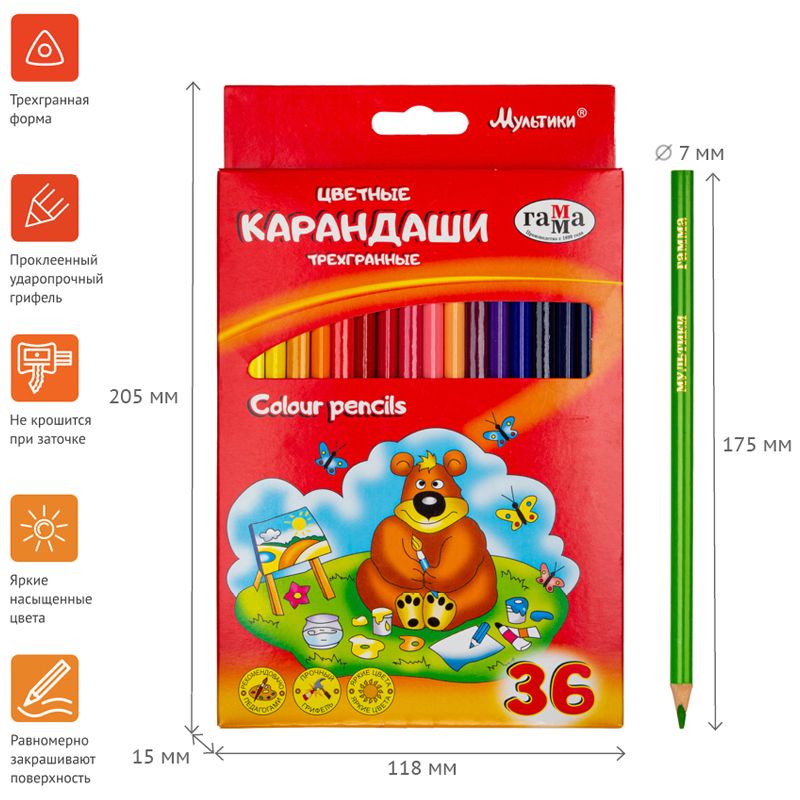 Карандаши цветные Гамма "Мультики", 36цв., трехгранные, заточен., картон. упаковка, европодвес