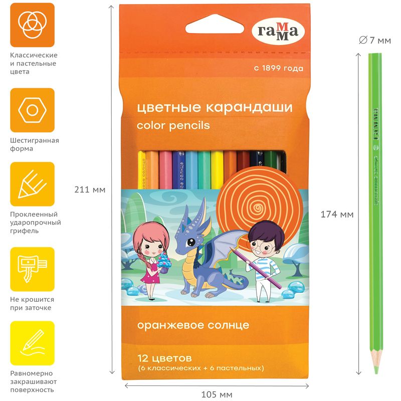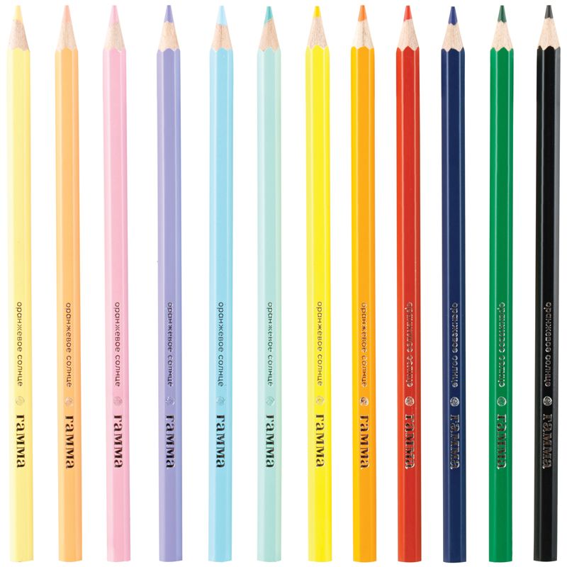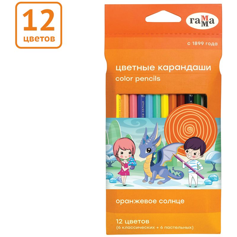 Карандаши цветные Гамма "Оранжевое солнце", 12цв. (6 классич. + 6 пастельных), заточен., картон, европодвес