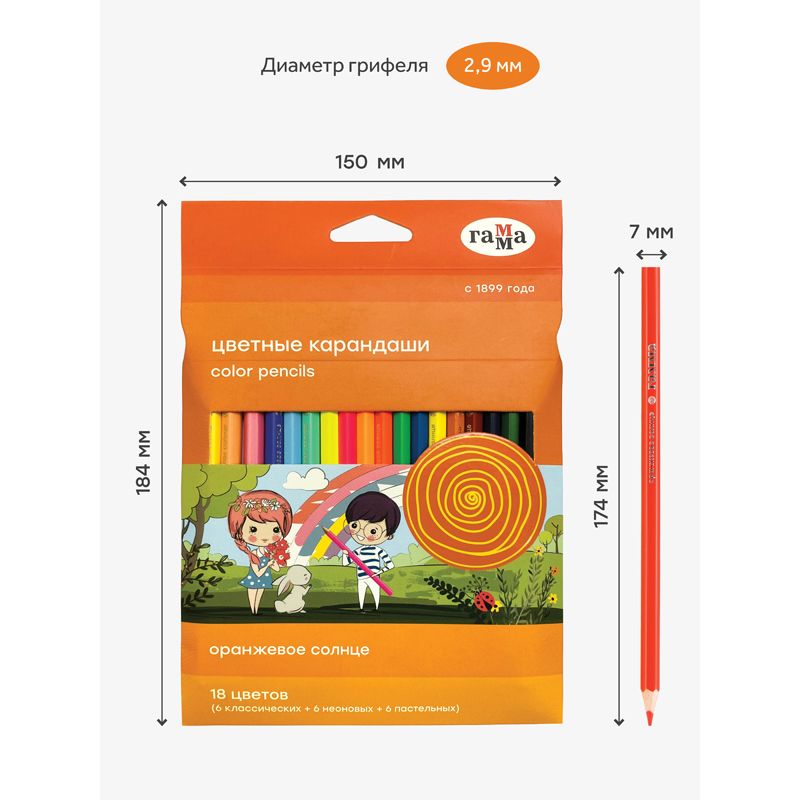 Карандаши цветные Гамма "Оранжевое солнце", 18цв. (6 классич. + 6 неон. + 6 пастельн.), заточен., картон, европодвес