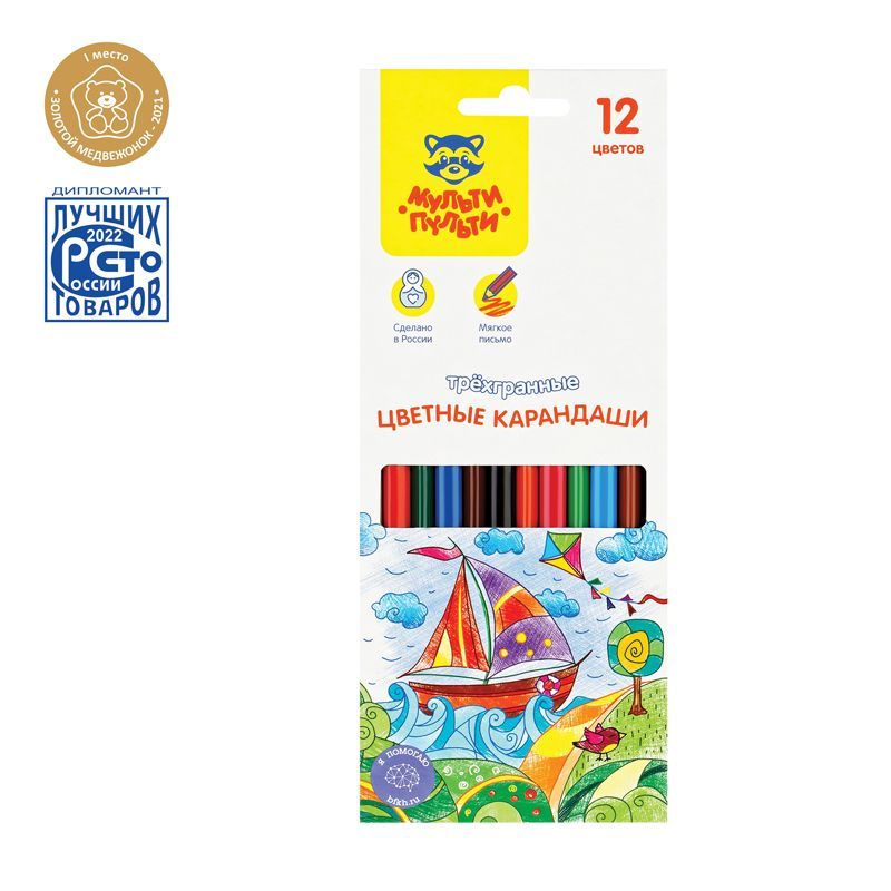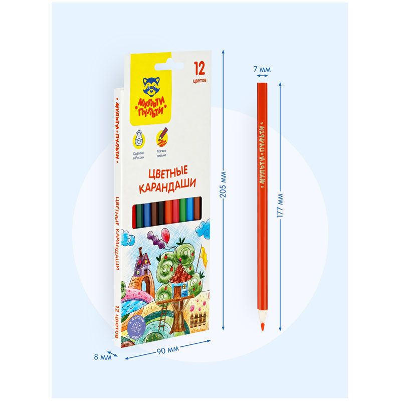 В наборе 12 цветов, диаметр грифеля составляет 3 мм, что увеличивает срок службы карандаша. Карандаши упакованы в картонную коробку с глянцевой ламинацией и европодвесом. Товар предназначен для детей старше 3-х лет.