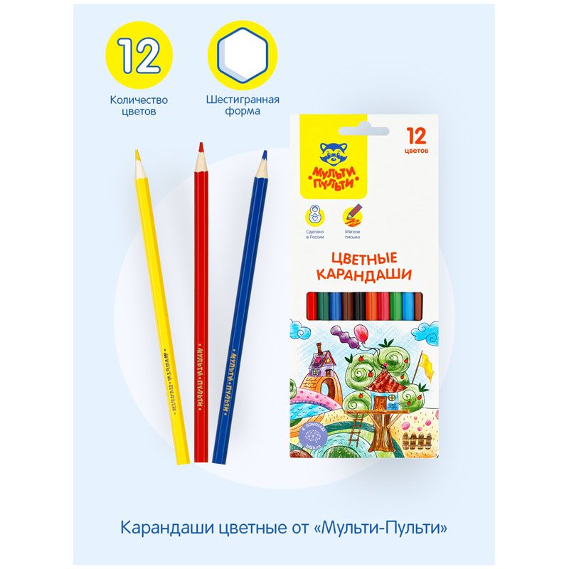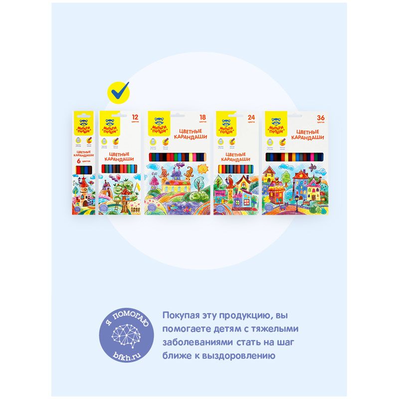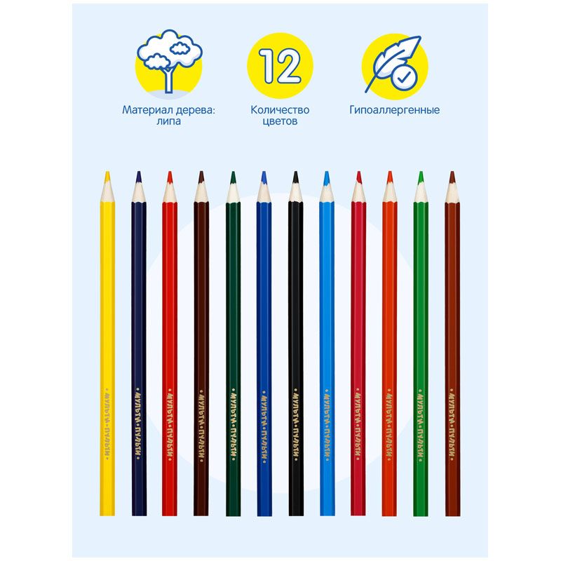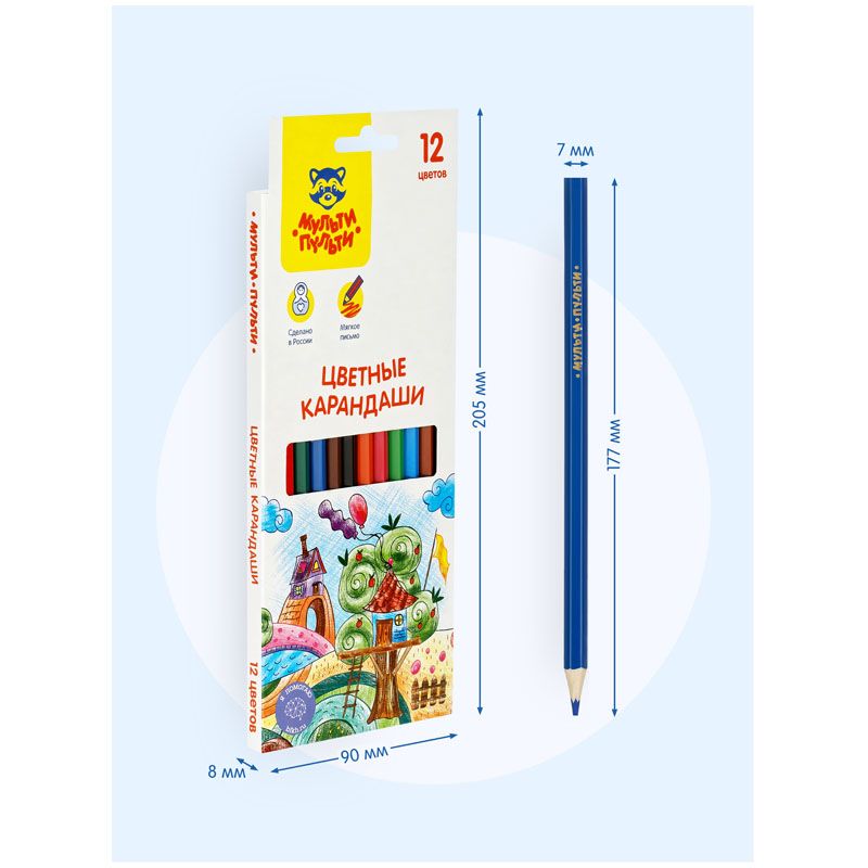 В наборе 12 цветов, диаметр грифеля составляет 3 мм, что увеличивает срок службы карандаша. Карандаши упакованы в картонную коробку с глянцевой ламинацией и европодвесом. Товар предназначен для детей старше 3-х лет.