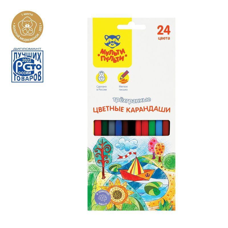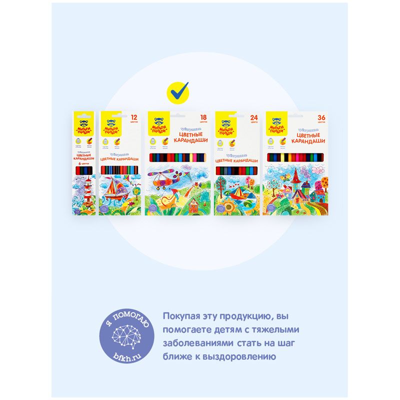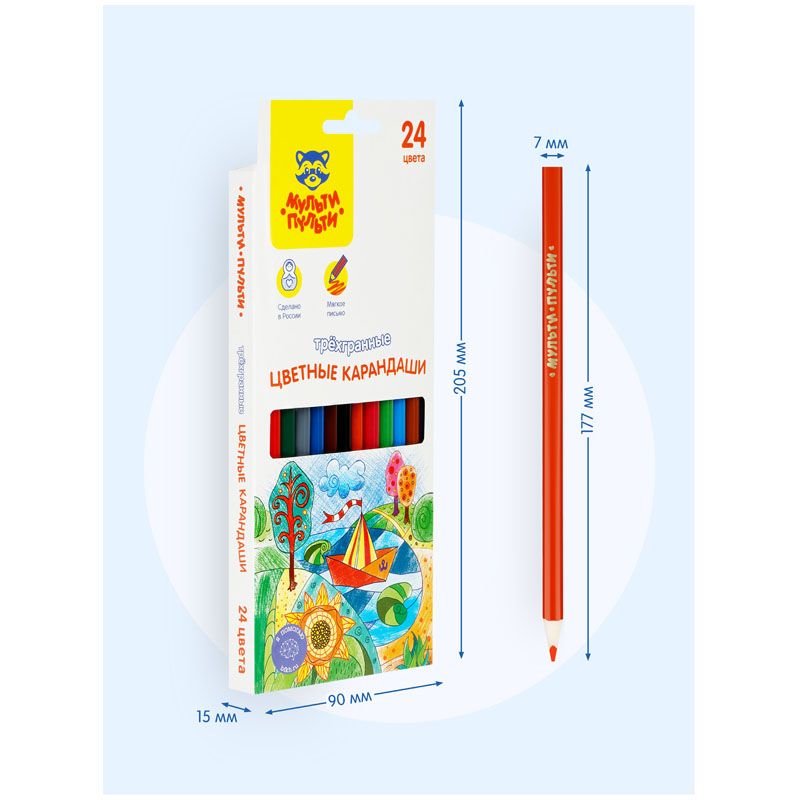 В наборе 24 цвета, диаметр грифеля составляет 3 мм, что увеличивает срок службы карандаша. Карандаши упакованы в картонную коробку с глянцевой ламинацией и европодвесом. Товар предназначен для детей старше 3-х лет.