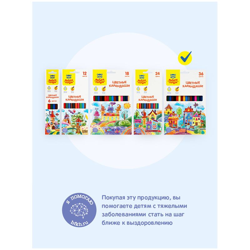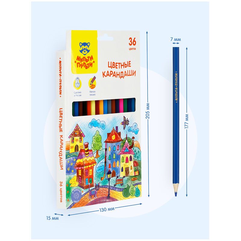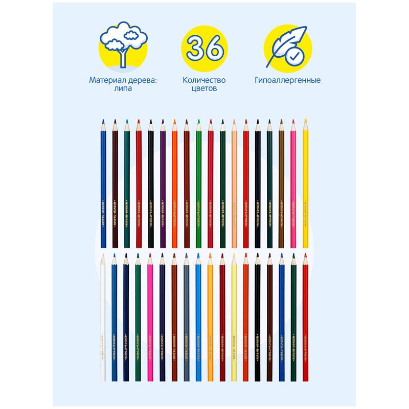 В наборе 36 цветов, диаметр грифеля составляет 3 мм, что увеличивает срок службы карандаша. Карандаши упакованы в картонную коробку с глянцевой ламинацией и европодвесом. Товар предназначен для детей старше 3-х лет.