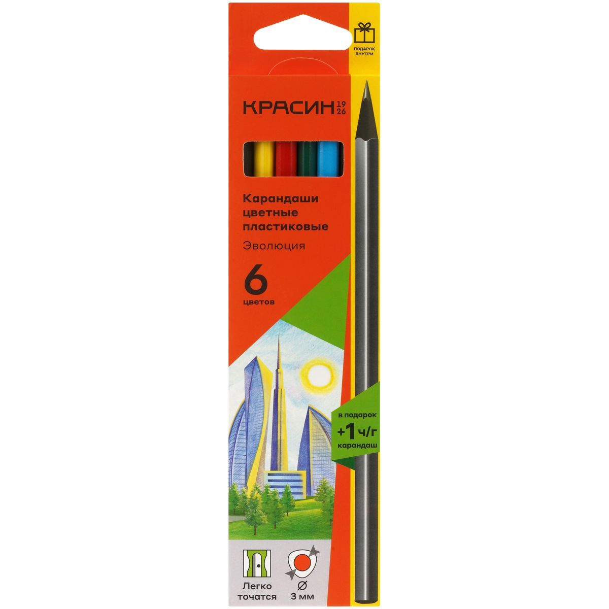 Карандаши цветные пластиковые Красин "Эволюция", 06цв.+1 ч/г HB, заточен., картон, европодвес