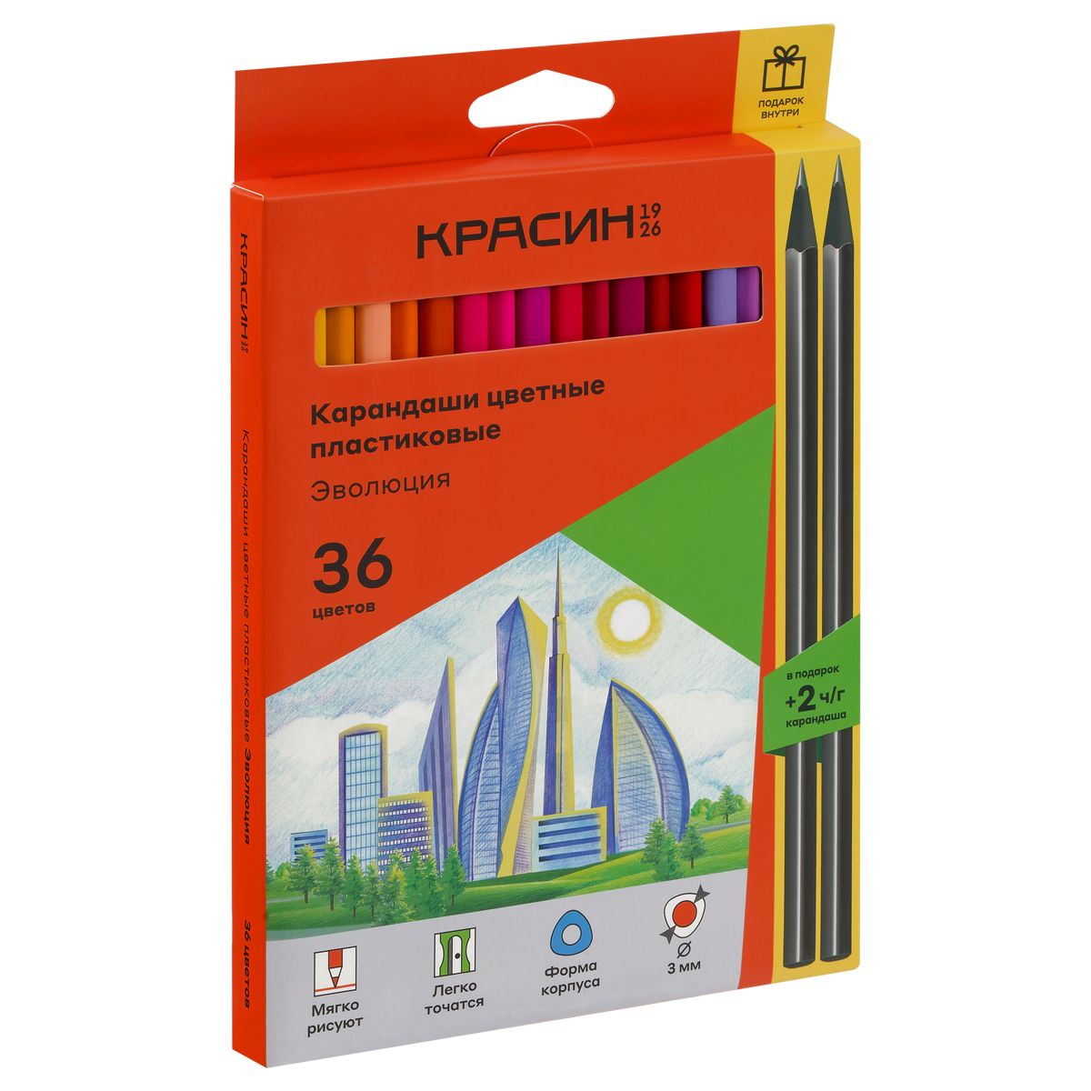Карандаши цветные пластиковые Красин "Эволюция", 36цв.+2 ч/г HB, заточен., картон, европодвес