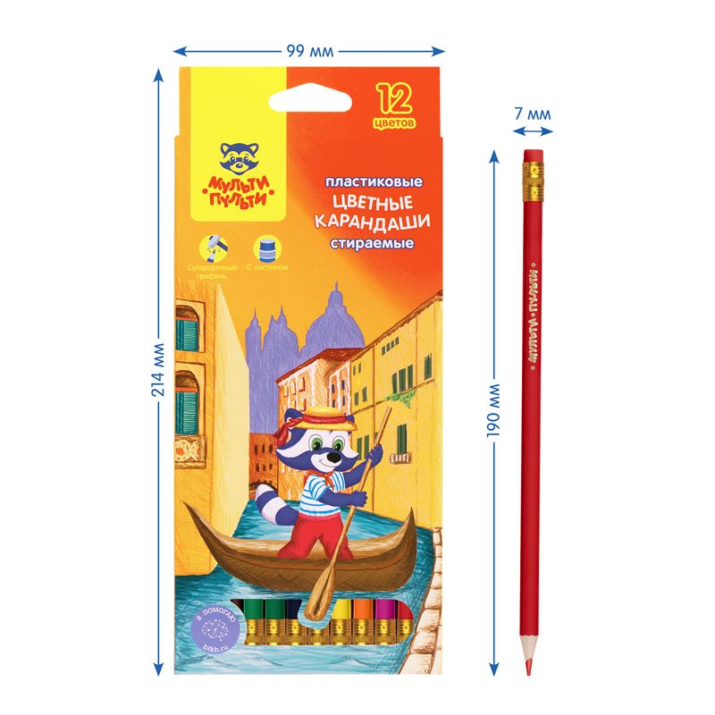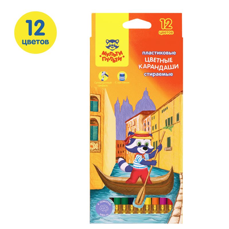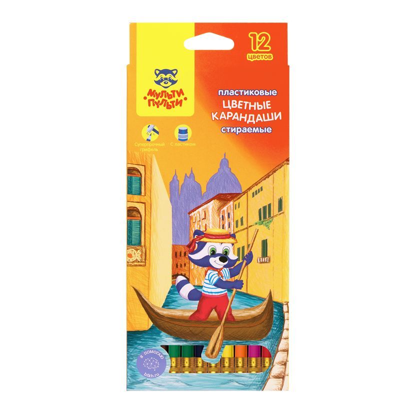 Карандаши цветные пластиковые стираемые Мульти-Пульти "Енот в Венеции", 12цв., с ласт., заточ., картон