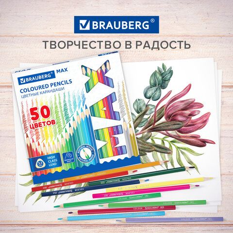 Карандаши цветные супермягкие яркие трехгранные BRAUBERG MAX, 50 цветов, грифель мягкий 3,3 мм, 181860