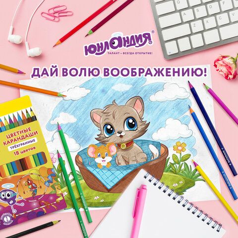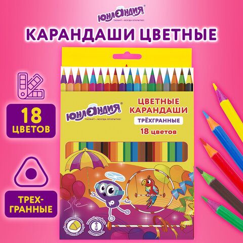 Карандаши цветные ЮНЛАНДИЯ "КАРНАВАЛ", 18 цветов, пластиковые, заточенные, трехгранный корпус, 181685