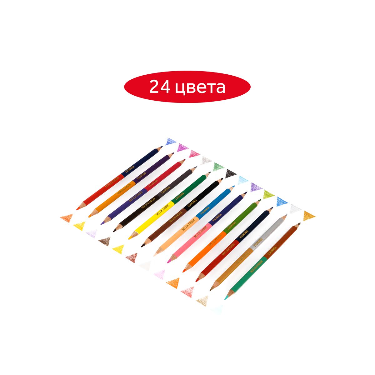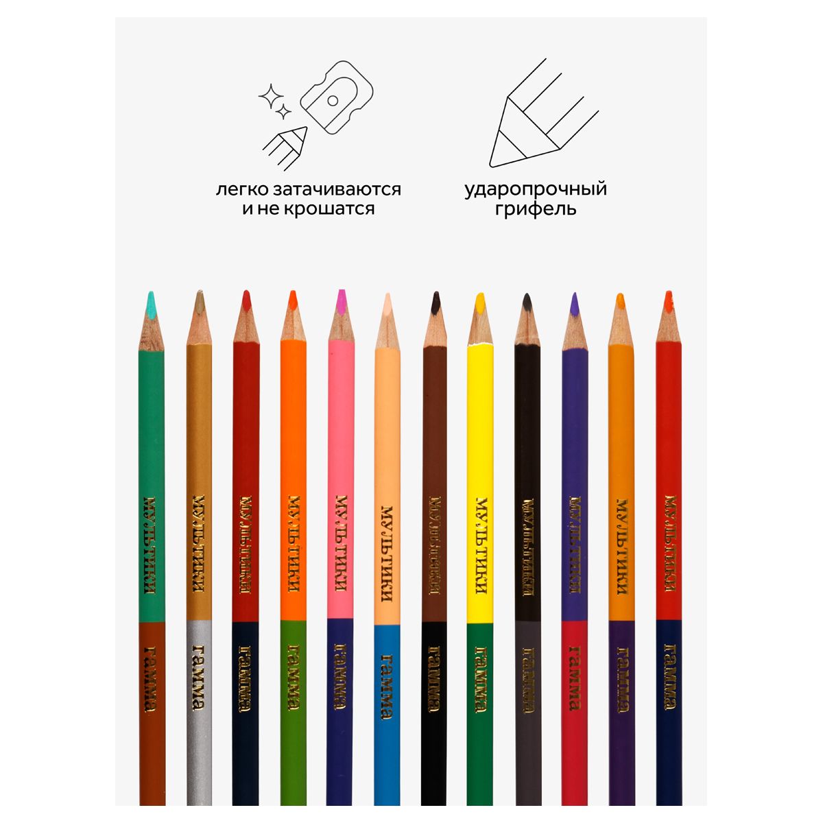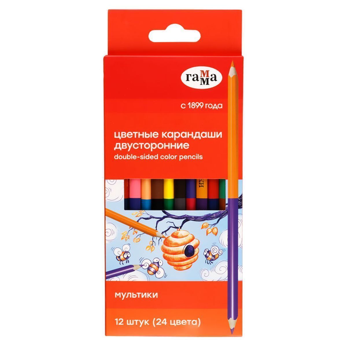 Двусторонние цветные карандаши ГАММА серии «Мультики» помогут экономить место в пенале и получить в 2 раза больше цветов. В наборе 12 карандашей и 24 цвета. Диаметр грифеля — 2,9 мм. Проклеенный ударопрочный грифель не крошится во время заточки и не ломается даже после падения. Корпус карандаша диаметром 7 мм и длиной 174 мм изготовлен из дерева. Эргономичный трехгранный корпус позволяет удобно располагать карандаш в детской руке и предотвращает его скатывание со стола. Специальная обработка натуральной древесины позволяет легко заточить карандаш без зазубрин и заноз. За яркость и высокую укрывистость отвечают качественные пигменты в составе. Ребенку не придется сильно давить на карандаш — рисунок получится ярким и равномерно закрашенным. Упаковка – картонная коробка с европодвесом.