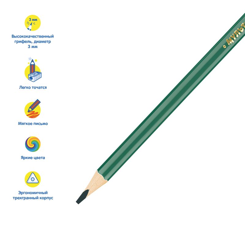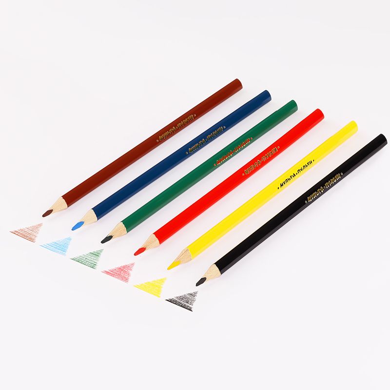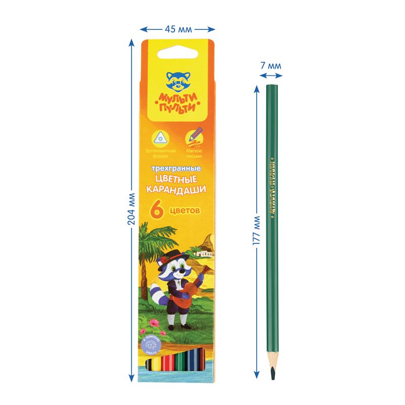 Карандаши цветные с заточенным грифелем, с эргономичной трехгранной формой корпуса. Яркие насыщенные цвета. Мягкое письмо. Карандаши легко затачиваются. Упакованы в картонную лакированную коробку со склеенным европодвесом. Для детей старше 3-х лет.