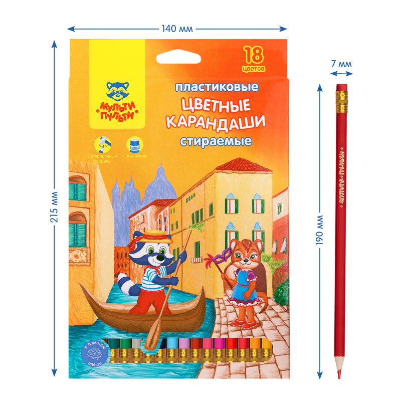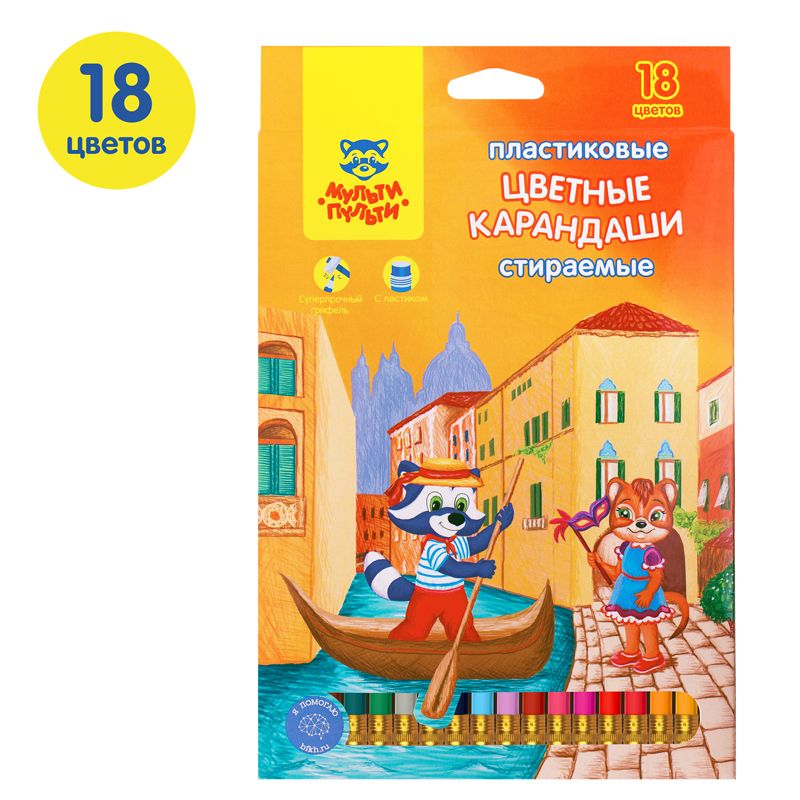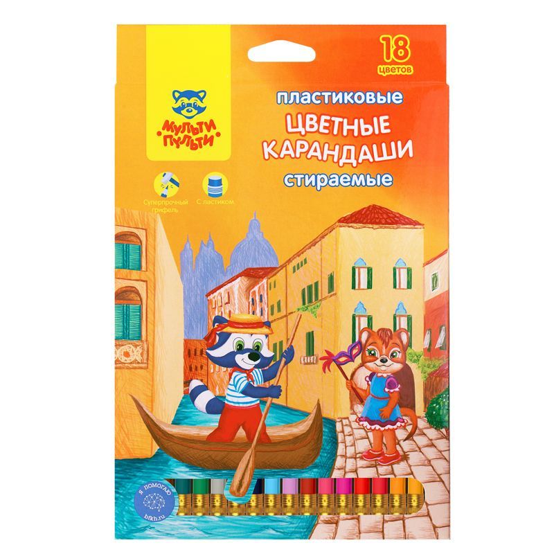 УЦЕНКА - Карандаши цветные пластиковые стираемые Мульти-Пульти "Енот в Венеции", 18цв., с ласт., заточ., картон