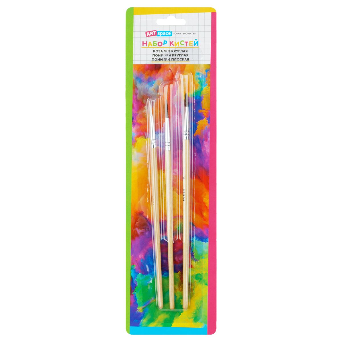 Набор кистей ArtSpace 3шт., Коза, круглая № 3, Пони, круглая № 4, Пони, плоская № 6, блистер, европодвес