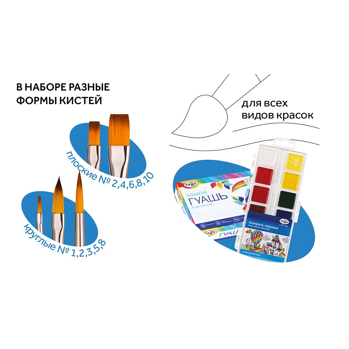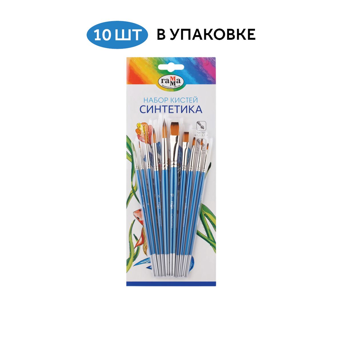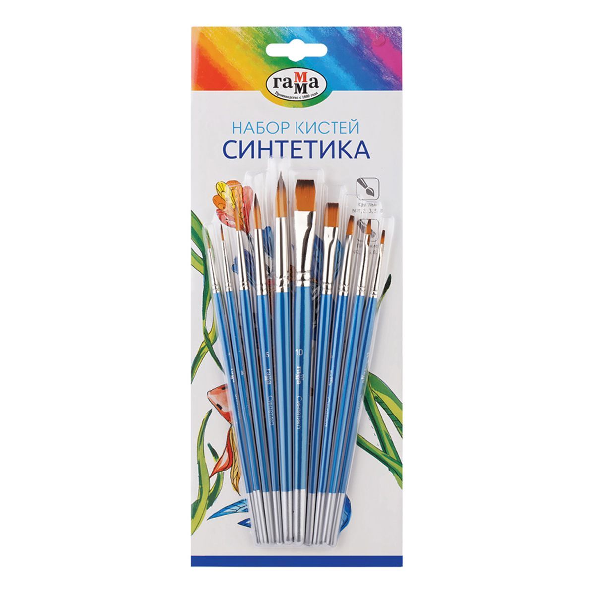 Набор кистей Гамма "Классические" 10шт., синтетика, круглые № 1, 2, 3, 5, 8, плоские № 2, 4, 6, 8, 10, блистер, европодвес