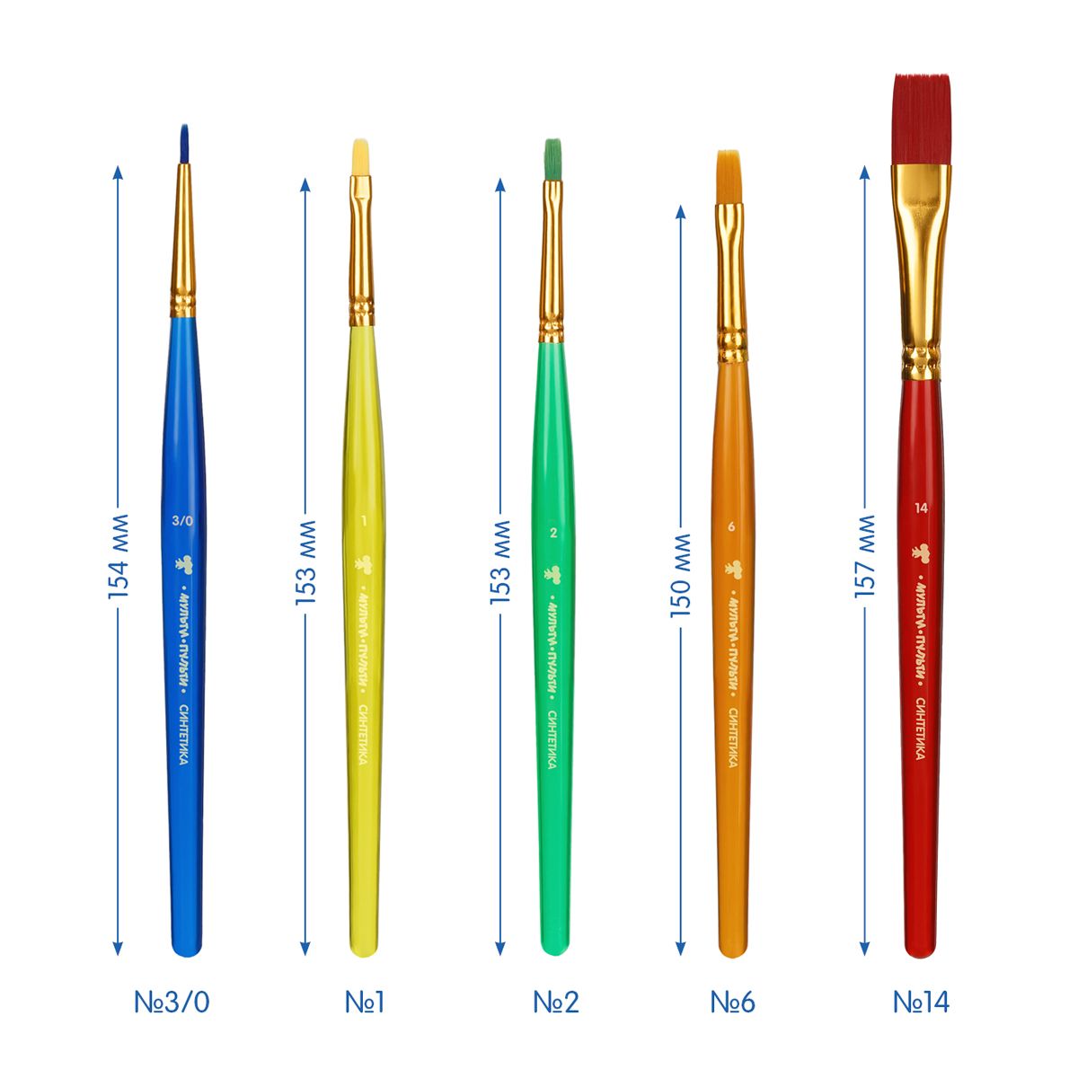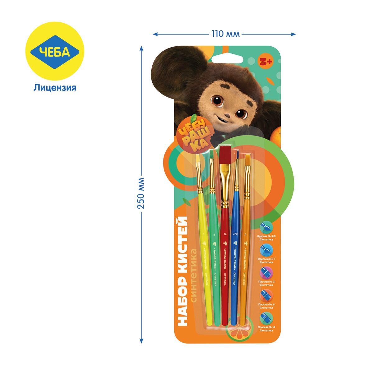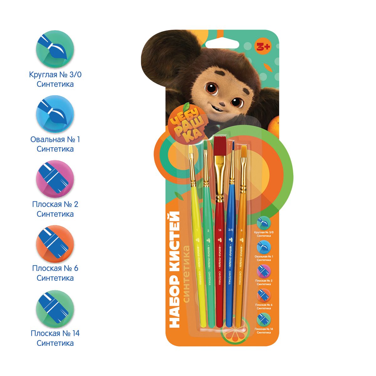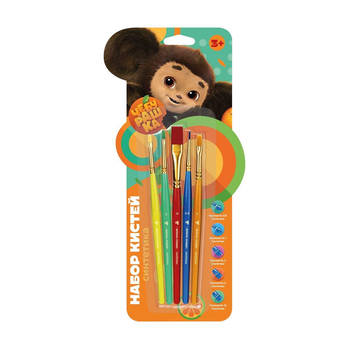 Набор кистей Мульти-Пульти "Чебурашка" 5шт., синтетика, круглая № 3, плоские № 2, 6, 14, овальная № 1, блистер