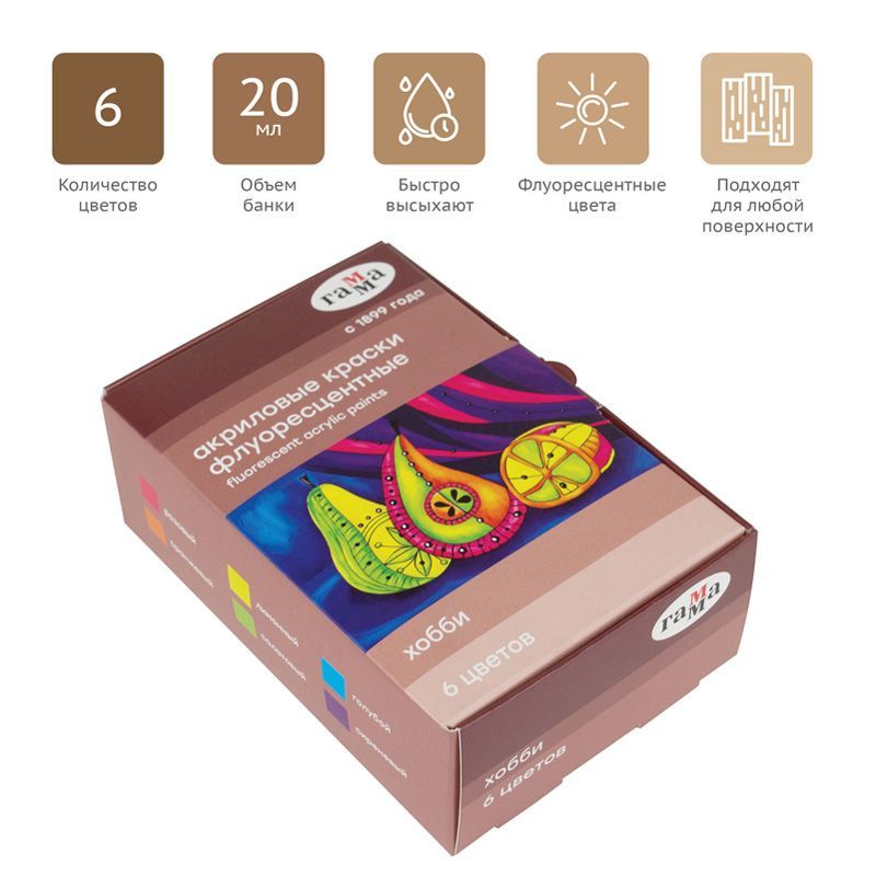 Краски акриловые декоративные Гамма "Хобби", 06 цветов, 20мл, флуоресц., картон. упаковка