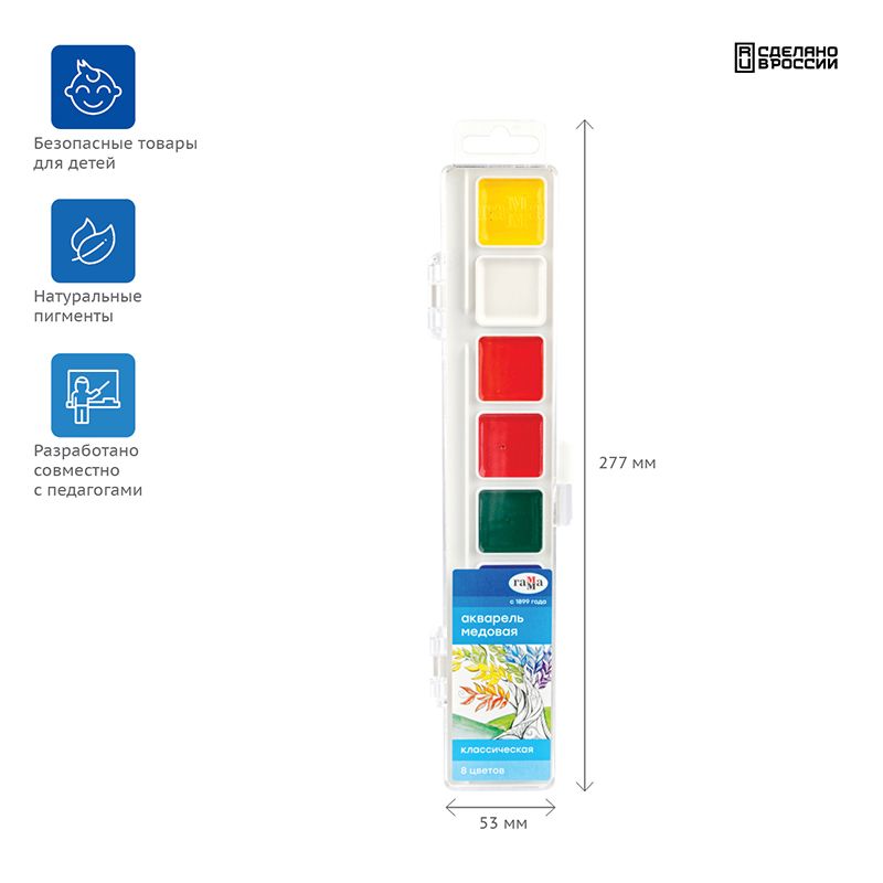 Естественные цвета акварели обучают правильному цветовосприятию окружающего мира. Краски изготовлены на основе органических пигментов и натурального связующего. Прозрачность красок, яркость и чистота цвета, разносимость и размываемость - основные характеристики акварели данной серии.