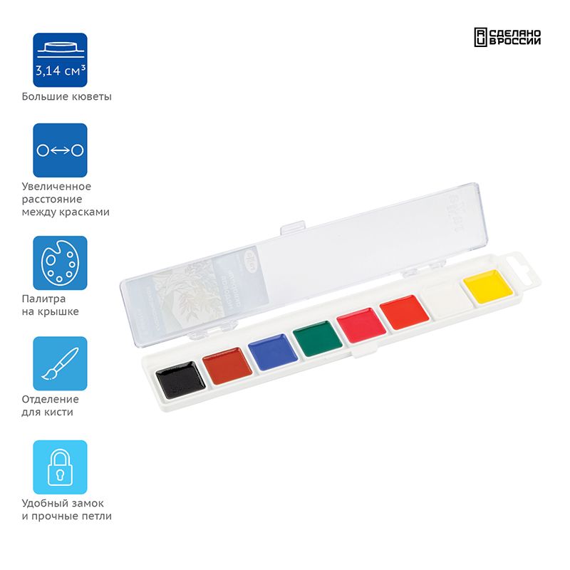 Кюветы с высокими бортиками и увеличенным расстоянием между красками предназначены для удобства в работе детей. Палитра для смешивания красок расположена на крышке. Акварель легко смывается с рук и отстирывается с одежды.