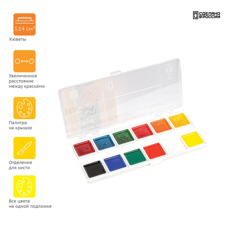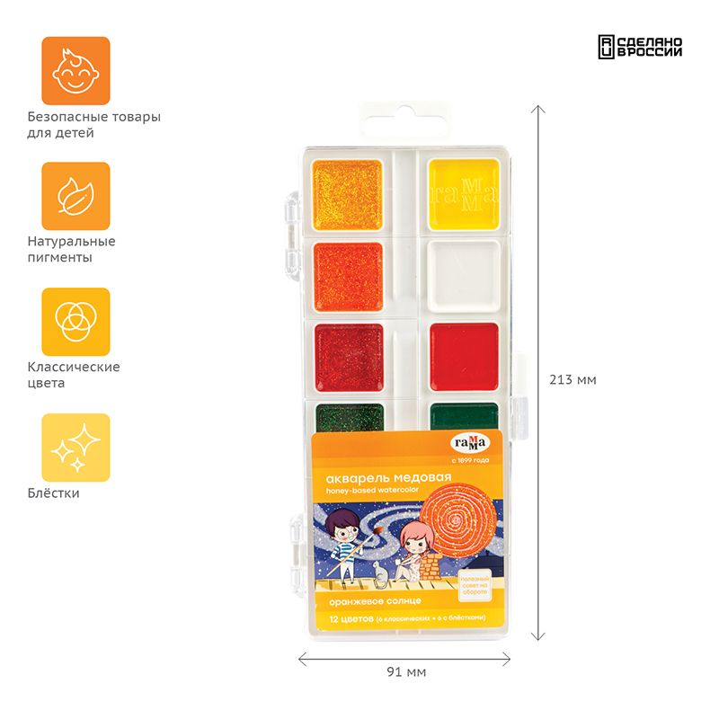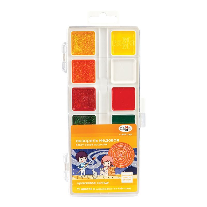 Акварель Гамма "Оранжевое солнце", медовая, 12 цветов (6 цв. с блестками.+ 6 классич.), без кисти, пластик. упак., европодвес